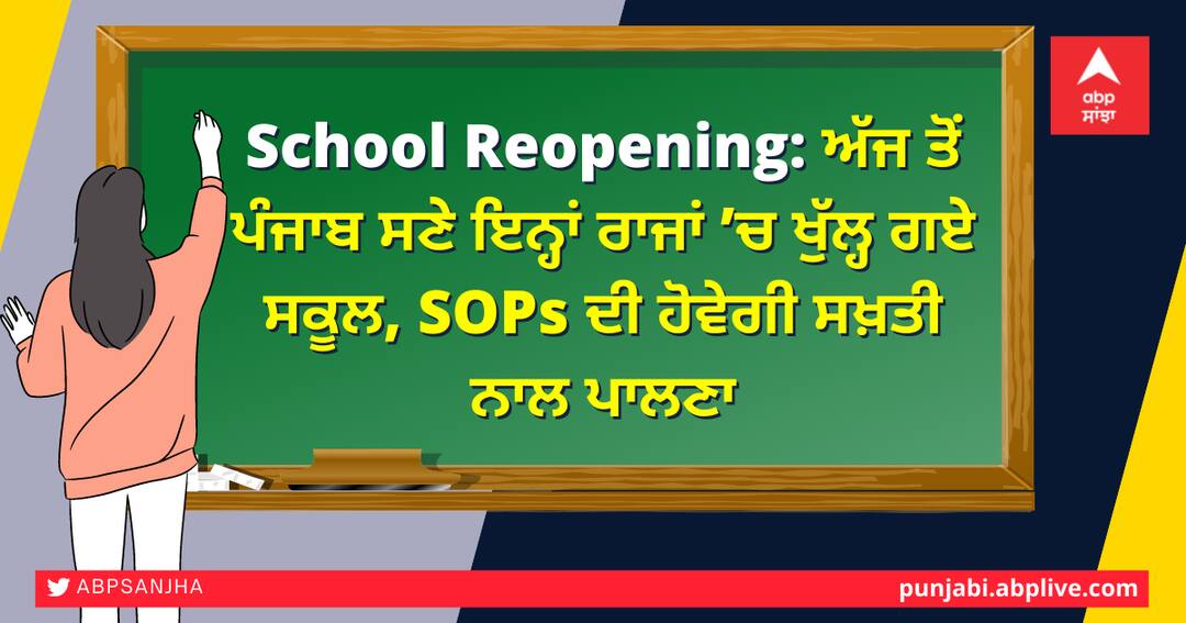 ਨਵੀਂ ਦਿੱਲੀ: ਕੋਰੋਨਾ ਮਹਾਂਮਾਰੀ ਦੇ ਖਤਰੇ ਕਾਰਨ ਸਕੂਲ ਤੇ ਕਾਲਜ ਲੰਬੇ ਸਮੇਂ ਤੋਂ ਬੰਦ ਰਹੇ ਹਨ। ਹੁਣ ਜਦੋਂ ਕੋਰੋਨਾ ਮਹਾਂਮਾਰੀ ਦੀ ਦੂਜੀ ਲਹਿਰ ਕਮਜ਼ੋਰ ਹੋ ਰਹੀ ਹੈ ਤੇ ਲਾਗ ਦੇ ਸਰਗਰਮ ਮਾਮਲੇ ਵੀ ਘਟ ਰਹੇ ਹਨ। ਬਹੁਤ ਸਾਰੇ ਰਾਜਾਂ ਨੇ ਲੌਕਡਾਊਨ ਦੀਆਂ ਰੋਕਾਂ ਵਿੱਚ ਢਿੱਲ ਦੇਣੀ ਸ਼ੁਰੂ ਕਰ ਦਿੱਤੀ ਹੈ। ਇਸੇ ਲਈ ਅੱਜ ਤੋਂ ਪੰਜਾਬ ਤੇ ਕੁਝ ਹੋਰ ਰਾਜਾਂ ਦੇ ਸਕੂਲ ਤੇ ਕਾਲਜ ਵੀ ਮੁੜ ਖੁਲ੍ਹਣੇ ਸ਼ੁਰੂ ਹੋ ਗਏ ਹਨ। ਕਈ ਰਾਜਾਂ ਵਿੱਚ ਪਹਿਲਾਂ ਹੀ ਉੱਚ ਕਲਾਸਾਂ ਦੇ ਸਕੂਲ ਖੋਲ੍ਹੇ ਜਾ ਚੁੱਕੇ ਹਨ, ਜਦੋਂ ਕਿ ਪੰਜਾਬ ਦੇ ਨਾਲ-ਨਾਲ ਮੱਧ ਪ੍ਰਦੇਸ਼, ਗੁਜਰਾਤ ਆਦਿ ਵਿੱਚ, ਅੱਜ ਤੋਂ ਸਕੂਲਾਂ ਵਿੱਚ ਬੱਚਿਆਂ ਦੀਆਂ ਗਤੀਵਿਧੀਆਂ ਫਿਰ ਤੋਂ ਸ਼ੁਰੂ ਹੋ ਗਈਆਂ ਹਨ। ਆਓ ਜਾਣਦੇ ਹਾਂ ਕਿ ਅੱਜ ਕਿਹੜੇ ਰਾਜਾਂ ਵਿੱਚ ਸਕੂਲ ਖੁੱਲ੍ਹ ਗਏ ਹਨ। ਅੱਜ ਤੋਂ ਖੁੱਲ੍ਹੇ ਸਾਰੇ ਸਕੂਲਾਂ ਵਿੱਚ ਕੋਵਿਡ-19 ਲਈ ਤੈਅ ਪਾਬੰਦੀਆਂ ਤੇ ਹਰ ਤਰ੍ਹਾਂ ਦੇ SOPs ਦਾ ਪੂਰਾ ਖ਼ਿਆਲ ਰੱਖਿਆ ਜਾ ਰਿਹਾ ਹੈ। ਪੰਜਾਬਅੱਜ ਤੋਂ 10 ਵੀਂ ਤੋਂ 12 ਵੀਂ ਜਮਾਤ ਲਈ ਪੰਜਾਬ ਵਿੱਚ ਸਕੂਲ ਖੁੱਲ੍ਹ ਗਏ ਹਨ। ਹਾਲਾਂਕਿ, ਸਿਰਫ ਉਨ੍ਹਾਂ ਅਧਿਆਪਕਾਂ ਤੇ ਸਟਾਫ ਨੂੰ ਹੀ ਸਕੂਲਾਂ ਵਿੱਚ ਦਾਖਲ ਹੋਣ ਦੀ ਆਗਿਆ ਹੈ ਜਿਨ੍ਹਾਂ ਦਾ ਟੀਕਾਕਰਨ ਪੂਰੀ ਤਰ੍ਹਾਂ ਹੋ ਚੁੱਕਾ ਹੈ। ਇਸ ਦੇ ਨਾਲ ਹੀ, ਸਕੂਲਾਂ ਵਿੱਚ ਆਉਣ ਲਈ ਵਿਦਿਆਰਥੀਆਂ ਦੇ ਮਾਪਿਆਂ ਦੀ ਮਨਜ਼ੂਰੀ ਲਾਜ਼ਮੀ ਹੈ। ਇਸ ਦੌਰਾਨ, ਡਿਜੀਟਲ ਭਾਵ ਔਨਲਾਈਨ ਕਲਾਸਾਂ ਦਾ ਵਿਕਲਪ ਵੀ ਜਾਰੀ ਰਹੇਗਾ। ਜੇ ਸਥਿਤੀ ਕੰਟਰੋਲ ਅਧੀਨ ਰਹੀ ਤਾਂ ਬਾਕੀ ਕਲਾਸਾਂ ਨੂੰ ਵੀ 2 ਅਗਸਤ ਤੋਂ ਸ਼ੁਰੂ ਹੋਣ ਦਿੱਤਾ ਜਾਵੇਗਾ।