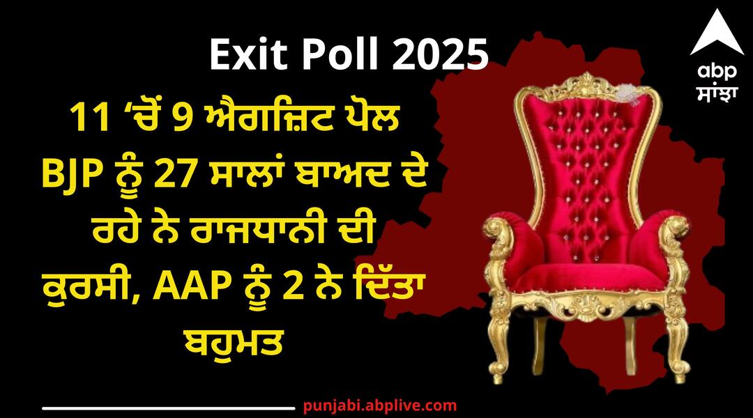 Delhi Exit Poll 2025: ਬੁੱਧਵਾਰ ਸ਼ਾਮ ਨੂੰ ਦਿੱਲੀ ਵਿਧਾਨ ਸਭਾ ਦੀਆਂ 70 ਸੀਟਾਂ ਲਈ ਵੋਟਿੰਗ ਖਤਮ ਹੋਣ ਤੋਂ ਬਾਅਦ, 11 ਐਗਜ਼ਿਟ ਪੋਲ ਜਾਰੀ ਕੀਤੇ ਗਏ। ਭਾਜਪਾ ਨੂੰ 9 ਪੋਲ ਵਿੱਚ ਬਹੁਮਤ ਮਿਲਣ ਦੀ ਉਮੀਦ ਹੈ ਜਦੋਂ ਕਿ ਆਮ ਆਦਮੀ ਪਾਰਟੀ (ਆਪ) ਨੂੰ 2 ਪੋਲ ਵਿੱਚ ਸਰਕਾਰ ਬਣਾਉਣ ਦੀ ਉਮੀਦ ਹੈ।