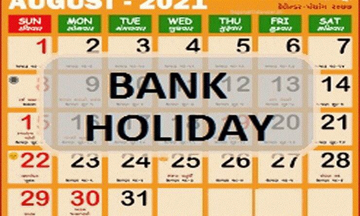 14 ਅਗਸਤ - ਦੂਜੇ ਸਨਿੱਚਰਵਾਰ ਨੂੰ ਬੈਂਕ ਬੰਦ ਰਹਿਣਗੇ। 15 ਅਗਸਤ - ਐਤਵਾਰ – ਹਫਤਾਵਾਰੀ ਛੁੱਟੀ। 16 ਅਗਸਤ - ਪਾਰਸੀ ਨਵਾਂ ਸਾਲ - ਮੁੰਬਈ, ਨਾਗਪੁਰ ਤੇ ਬੇਲਾਪੁਰ ਵਿੱਚ ਬੈਂਕ ਬੰਦ ਰਹਿਣਗੇ। 19 ਅਗਸਤ - ਮੁਹੱਰਮ ਦੀ ਛੁੱਟੀ - ਅਗਰਤਲਾ, ਅਹਿਮਦਾਬਾਦ, ਹੈਦਰਾਬਾਦ, ਜੈਪੁਰ, ਜੰਮੂ, ਕਾਨਪੁਰ, ਕੋਲਕਾਤਾ, ਲਖਨਊ, ਮੁੰਬਈ, ਨਾਗਪੁਰ, ਨਵੀਂ ਦਿੱਲੀ, ਪਟਨਾ, ਸ੍ਰੀਨਗਰ, ਰਾਏਪੁਰ ਵਿੱਚ ਬੈਂਕ ਬੰਦ ਰਹਿਣਗੇ। 20 ਅਗਸਤ - ਬੈਂਗਲੁਰੂ, ਚੇਨਈ, ਕੋਚੀ ਤੇ ਤਿਰੂਵਨੰਤਪੁਰਮ ਵਿੱਚ ਮੁਹੱਰਮ ਤੇ ਓਨਮ ਦੇ ਤਿਉਹਾਰਾਂ ਦੇ ਕਾਰਨ ਬੈਂਕ ਬੰਦ ਰਹਿਣਗੇ। 21 ਅਗਸਤ- ਤਿਰੂਓਨਮ ਕਾਰਨ ਕੋਚੀ ਤੇ ਤਿਰੂਵਨੰਤਪੁਰਮ ਵਿੱਚ ਬੈਂਕ ਬੰਦ ਰਹਿਣਗੇ। 22 ਅਗਸਤ - ਐਤਵਾਰ - ਹਫਤਾਵਾਰੀ ਛੁੱਟੀ ਹੋਵੇਗੀ। 23 ਅਗਸਤ - ਸ਼੍ਰੀ ਨਾਰਾਇਣ ਗੁਰੂ ਜਯੰਤੀ - ਕੋਚੀ ਤੇ ਤਿਰੂਵਨੰਤਪੁਰਮ ਵਿੱਚ ਬੈਂਕ ਬੰਦ ਰਹਿਣਗੇ। 28 ਅਗਸਤ - ਮਹੀਨੇ ਦਾ ਚੌਥਾ ਸਨਿੱਚਰਵਾਰਵਾਰ, ਇਹ ਦਿਨ ਬੈਂਕ ਕਰਮਚਾਰੀਆਂ ਲਈ ਵੀ ਛੁੱਟੀ ਵਾਲਾ ਦਿਨ ਹੋਵੇਗਾ। 29 ਅਗਸਤ - ਐਤਵਾਰ - ਹਫਤਾਵਾਰੀ ਛੁੱਟੀ 30 ਅਗਸਤ - ਜਨਮ ਅਸ਼ਟਮੀ, ਕ੍ਰਿਸ਼ਨਾ ਜਯੰਤੀ ਦੇ ਕਾਰਨ ਅਹਿਮਦਾਬਾਦ, ਚੇਨਈ, ਦੇਹਰਾਦੂਨ, ਗੰਗਟੋਕ, ਗੁਹਾਟੀ, ਜੈਪੁਰ, ਜੰਮੂ, ਕਾਨਪੁਰ, ਲਖਨਊ, ਪਣਜੀ, ਪਟਨਾ, ਰਾਏਪੁਰ, ਰਾਂਚੀ, ਸ਼ਿਲਾਂਗ, ਸ਼ਿਮਲਾ ਵਿੱਚ ਬੈਂਕ ਬੰਦ ਰਹਿਣਗੇ। 31 ਅਗਸਤ: ਸ਼੍ਰੀ ਕ੍ਰਿਸ਼ਨ ਜਨਮਅਸ਼ਟਮੀ ਕਾਰਨ ਇਸ ਦਿਨ ਹੈਦਰਾਬਾਦ ਵਿੱਚ ਬੈਂਕ ਨਹੀਂ ਖੁੱਲ੍ਹਣਗੇ।