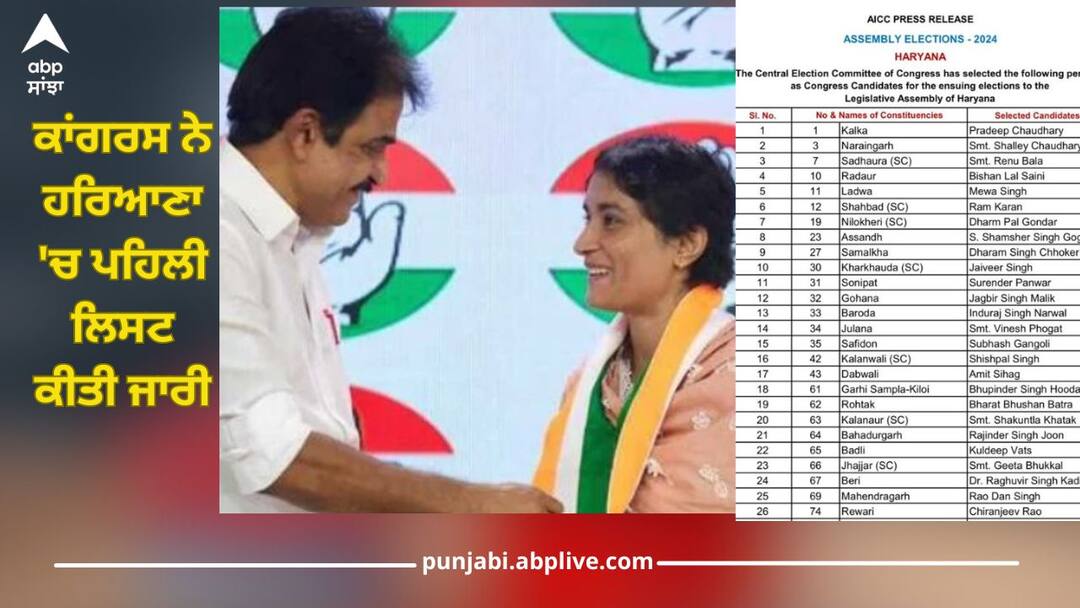 Haryana Congress Candidate List 2024: ਹਰਿਆਣਾ ਵਿਧਾਨ ਸਭਾ ਚੋਣਾਂ ਲਈ ਕਾਂਗਰਸ ਨੇ ਆਪਣੇ ਉਮੀਦਵਾਰਾਂ ਦੀ ਪਹਿਲੀ ਸੂਚੀ ਜਾਰੀ ਕਰ ਦਿੱਤੀ ਹੈ। ਕਾਂਗਰਸ ਨੇ ਇਸ ਸੂਚੀ ਵਿੱਚ ਆਪਣੇ 31 ਉਮੀਦਵਾਰਾਂ ਦੇ ਨਾਵਾਂ ਦਾ ਐਲਾਨ ਕੀਤਾ ਹੈ। ਕਾਂਗਰਸ ਨੇ ਸ਼ੁੱਕਰਵਾਰ ਨੂੰ ਹੀ ਪਾਰਟੀ 'ਚ ਸ਼ਾਮਲ ਹੋਈ ਪਹਿਲਵਾਨ ਵਿਨੇਸ਼ ਫੋਗਾਟ ਨੂੰ ਜੀਂਦ ਦੇ ਜੁਲਾਨਾ ਵਿਧਾਨ ਸਭਾ ਤੋਂ ਆਪਣਾ ਉਮੀਦਵਾਰ ਬਣਾਇਆ ਹੈ। ਇਸ ਤੋਂ ਇਲਾਵਾ ਗੜ੍ਹੀ ਸਾਂਪਲਾ ਕਿਲੋਈ ਵਿਧਾਨ ਸਭਾ ਸੀਟ ਤੋਂ ਸਾਬਕਾ ਸੀਐਮ ਭੁਪਿੰਦਰ ਸਿੰਘ ਹੁੱਡਾ ਨੂੰ ਟਿਕਟ ਦਿੱਤੀ ਗਈ ਹੈ।
