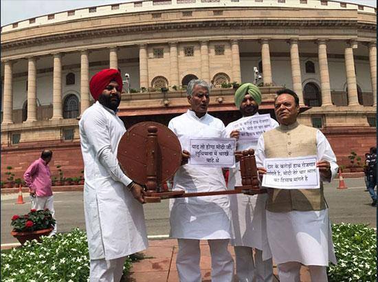 ਕਾਂਗਰਸੀ ਸੰਸਦ ਮੈਂਬਰਾਂ ਨੇ ਮੋਦੀ ਸਰਕਾਰ ਨੂੰ ਚਰਖੇ ਨਾਲ ਘੇਰਿਆ