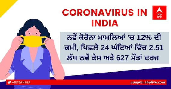 Coronavirus Cases Update in India: ਦੇਸ਼ ਵਿੱਚ ਘਾਤਕ ਕੋਰੋਨਾਵਾਇਰਸ ਮਹਾਂਮਾਰੀ ਦੇ ਕੇਸ ਕੱਲ੍ਹ ਦੇ ਮੁਕਾਬਲੇ ਅੱਜ ਘੱਟ ਗਏ ਹਨ। ਦੇਸ਼ 'ਚ ਪਿਛਲੇ 24 ਘੰਟਿਆਂ 'ਚ ਕੋਰੋਨਾ ਵਾਇਰਸ ਦੇ 2 ਲੱਖ 51 ਹਜ਼ਾਰ 209 ਨਵੇਂ ਮਾਮਲੇ ਸਾਹਮਣੇ ਆਏ ਹਨ ਅਤੇ 627 ਲੋਕਾਂ ਦੀ ਮੌਤ ਹੋ ਗਈ ਹੈ। ਦੇਸ਼ ਵਿੱਚ ਰੋਜ਼ਾਨਾ ਸਕਾਰਾਤਮਕਤਾ ਦਰ ਘਟ ਕੇ 15.88 ਫੀਸਦੀ 'ਤੇ ਆ ਗਈ ਹੈ। ਜਾਣੋ ਦੇਸ਼ 'ਚ ਕੋਰੋਨਾ ਦੀ ਤਾਜ਼ਾ ਸਥਿਤੀ ਕੀ ਹੈ।