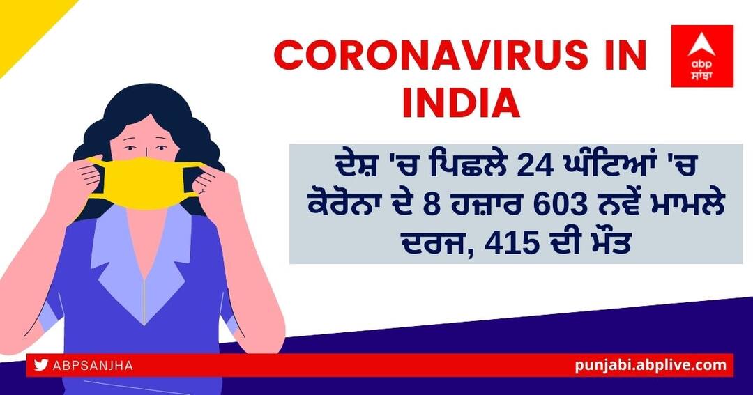 Coronavirus Cases Today: ਦੇਸ਼ ਵਿੱਚ ਘਾਤਕ ਕੋਰੋਨਾਵਾਇਰਸ ਦਾ ਪ੍ਰਕੋਪ ਜਾਰੀ ਹੈ। ਹਾਲਾਂਕਿ, ਹੁਣ ਕੇਸਾਂ ਵਿੱਚ ਕਮੀ ਆਈ ਹੈ। ਦੇਸ਼ 'ਚ ਪਿਛਲੇ 24 ਘੰਟਿਆਂ 'ਚ ਕੋਰੋਨਾ ਵਾਇਰਸ ਦੇ 8 ਹਜ਼ਾਰ 603 ਨਵੇਂ ਮਾਮਲੇ ਸਾਹਮਣੇ ਆਏ ਹਨ। ਇਸ ਦੇ ਨਾਲ ਹੀ 415 ਲੋਕਾਂ ਦੀ ਮੌਤ ਹੋ ਗਈ। ਜਾਣੋ ਦੇਸ਼ ਵਿੱਚ ਅੱਜ ਕੋਰੋਨਾ ਦੀ ਤਾਜ਼ਾ ਸਥਿਤੀ ਕੀ ਹੈ।