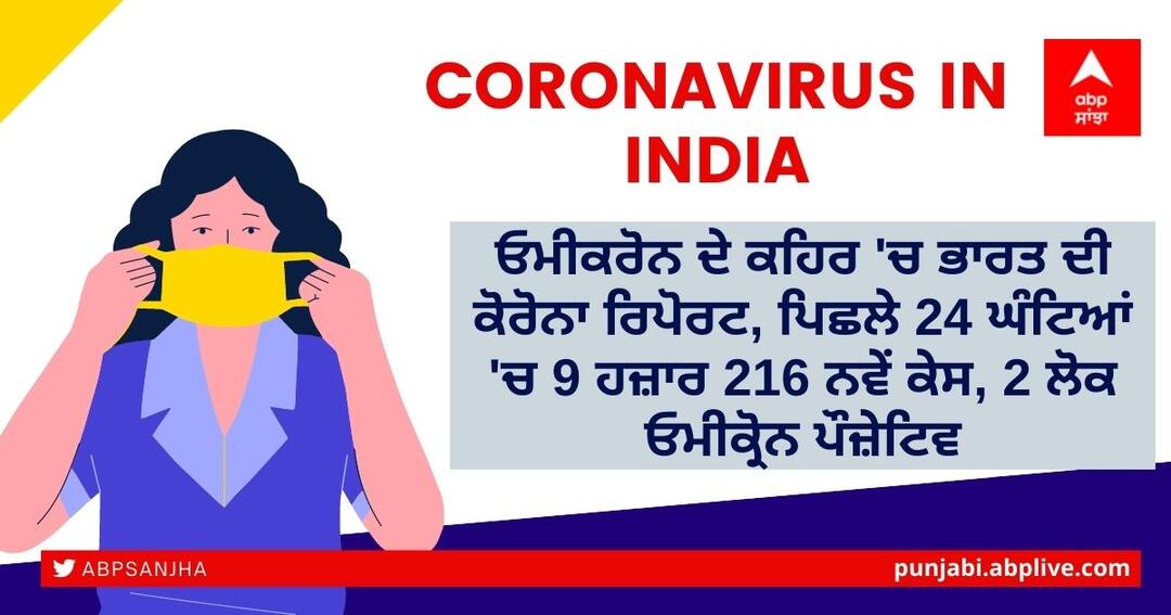 Coronavirus Cases Today: ਦੇਸ਼ 'ਚ ਜਾਨਲੇਵਾ ਕੋਰੋਨਾਵਾਇਰਸ ਦਾ ਕਹਿਰ ਜਾਰੀ ਹੈ। ਹਾਲਾਂਕਿ ਹੁਣ ਕੇਸਾਂ 'ਚ ਕਮੀ ਵੇਖਣ ਨੂੰ ਮਿਲ ਰਹੀ ਹੈ। ਦੇਸ਼ 'ਚ ਪਿਛਲੇ 24 ਘੰਟੇ 'ਚ ਕੋਰੋਨਾ ਵਾਇਰਸ ਦੇ 9 ਹਜ਼ਾਰ 216 ਨਵੇਂ ਮਾਮਲੇ ਸਾਹਮਣੇ ਆਏ ਹਨ। ਇਸ ਦੇ ਨਾਲ ਹੀ 391 ਲੋਕਾਂ ਦੀ ਮੌਤ ਹੋ ਗਈ। ਵੱਡੀ ਗੱਲ ਇਹ ਹੈ ਕਿ ਓਮੀਕ੍ਰੋਨ ਨੇ ਦੇਸ਼ 'ਚ ਦਸਤਕ ਦੇ ਦਿੱਤੀ ਹੈ। ਕਰਨਾਟਕ ਦੀ ਰਾਜਧਾਨੀ ਬੰਗਲੁਰੂ 'ਚ 2 ਲੋਕ ਓਮੀਕ੍ਰੋਨ ਵੇਰੀਐਂਟ ਨਾਲ ਪੌਜ਼ੇਟਿਵ ਪਾਏ ਗਏ ਹਨ। ਜਾਣੋ ਦੇਸ਼ 'ਚ ਅੱਜ ਕੋਰੋਨਾ ਦੀ ਤਾਜ਼ਾ ਸਥਿਤੀ ਕੀ ਹੈ?
