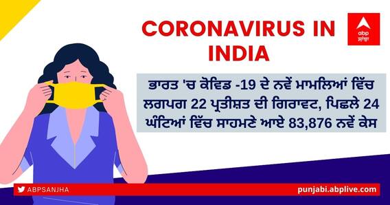 Corona Update in India: ਭਾਰਤ 'ਚ ਕੋਵਿਡ -19 ਦੇ ਨਵੇਂ ਮਾਮਲਿਆਂ ਵਿੱਚ ਲਗਪਗ 22 ਪ੍ਰਤੀਸ਼ਤ ਦੀ ਗਿਰਾਵਟ, ਪਿਛਲੇ 24 ਘੰਟਿਆਂ ਵਿੱਚ ਸਾਹਮਣੇ ਆਏ 83,876 ਨਵੇਂ ਕੇਸ