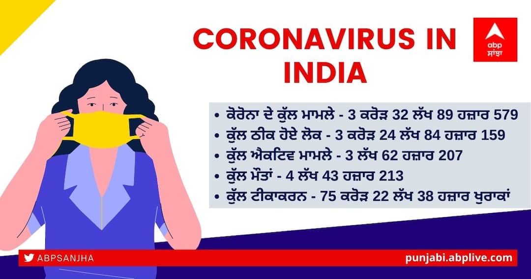ਕੋਰੋਨਾ ਮਹਾਮਾਰੀ ਦੀ ਸ਼ੁਰੂਆਤ ਤੋਂ ਲੈ ਕੇ ਹੁਣ ਤਕ ਕੁੱਲ 3 ਕਰੋੜ 32 ਲੱਖ 89 ਹਜ਼ਾਰ ਲੋਕ ਸੰਕਰਮਿਤ ਹੋਏ ਹਨ। ਇਨ੍ਹਾਂ ਵਿੱਚੋਂ 4 ਲੱਖ 43 ਹਜ਼ਾਰ 213 ਲੋਕਾਂ ਦੀ ਮੌਤ ਹੋ ਚੁੱਕੀ ਹੈ। ਰਾਹਤ ਵਾਲੀ ਗੱਲ ਇਹ ਹੈ ਕਿ ਹੁਣ ਤਕ 3 ਕਰੋੜ 24 ਲੱਖ 84 ਹਜ਼ਾਰ ਲੋਕ ਠੀਕ ਹੋ ਚੁੱਕੇ ਹਨ। ਦੇਸ਼ 'ਚ ਕੋਰੋਨਾ ਐਕਟਿਵ ਕੇਸਾਂ ਦੀ ਗਿਣਤੀ 4 ਲੱਖ ਤੋਂ ਘੱਟ ਹੈ। ਕੁੱਲ 3 ਲੱਖ 62 ਹਜ਼ਾਰ 207 ਲੋਕ ਅਜੇ ਵੀ ਕੋਰੋਨਾ ਵਾਇਰਸ ਨਾਲ ਸੰਕਰਮਿਤ ਹਨ, ਜਿਨ੍ਹਾਂ ਦਾ ਇਲਾਜ ਚੱਲ ਰਿਹਾ ਹੈ।