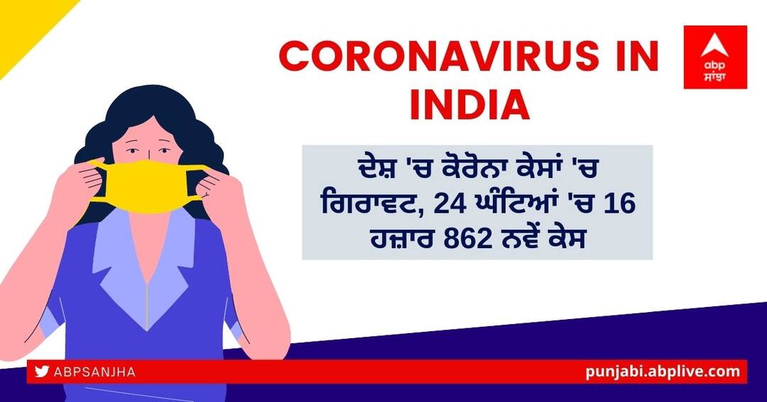 India Coronavirus Updates: ਦੇਸ਼ ਵਿੱਚ ਕੱਲ੍ਹ ਦੇ ਮੁਕਾਬਲੇ ਅੱਜ ਕੋਰੋਨਾ ਵਾਇਰਸ ਦੇ ਨਵੇਂ ਕੇਸਾਂ ਵਿੱਚ ਗਿਰਾਵਟ ਆਈ ਹੈ। ਪਿਛਲੇ 24 ਘੰਟਿਆਂ ਵਿੱਚ ਕੋਰੋਨਾ ਵਾਇਰਸ ਦੇ 16 ਹਜ਼ਾਰ 862 ਨਵੇਂ ਕੇਸ ਸਾਹਮਣੇ ਆਏ ਹਨ। ਇਸ ਦੌਰਾਨ 379 ਲੋਕਾਂ ਦੀ ਮੌਤ ਹੋ ਗਈ। ਕੱਲ੍ਹ ਦੇਸ਼ ਵਿੱਚ 18 ਹਜ਼ਾਰ 987 ਮਾਮਲੇ ਦਰਜ ਕੀਤੇ ਗਏ ਸਨ। ਜਾਣੋ ਅੱਜ ਦੇਸ਼ ਵਿੱਚ ਕੋਰੋਨਾ ਵਾਇਰਸ ਦੀ ਤਾਜ਼ਾ ਸਥਿਤੀ ਕੀ ਹੈ-