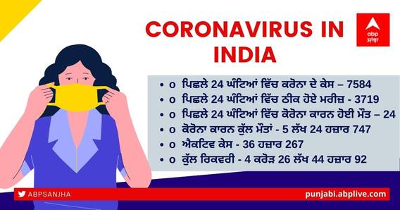 Covid-19 in India Update: ਦੁਨੀਆ ਭਰ ਵਿੱਚ ਕੋਰੋਨਾ ਦੀ ਲਾਗ ਵਿਰੁੱਧ ਜੰਗ ਅਜੇ ਵੀ ਜਾਰੀ ਹੈ। ਇਸ ਦੌਰਾਨ ਭਾਰਤ ਵਿੱਚ ਵੀ ਕੋਵਿਡ -19 ਸੰਕਰਮਣ ਦੇ ਮਾਮਲੇ ਵੱਧ ਰਹੇ ਹਨ। ਪਿਛਲੇ 24 ਘੰਟਿਆਂ ਵਿੱਚ ਦੇਸ਼ ਵਿੱਚ ਕੋਵਿਡ-19 ਦੇ 7,584 ਨਵੇਂ ਮਾਮਲੇ ਸਾਹਮਣੇ ਆਏ ਹਨ। ਉੱਥੇ ਹੀ ਪਿਛਲੇ 24 ਘੰਟਿਆਂ 'ਚ 24 ਲੋਕਾਂ ਦੀ ਕੋਰੋਨਾ ਵਾਇਰਸ ਕਾਰਨ ਮੌਤ ਹੋ ਗਈ ਹੈ। ਹੁਣ ਤੱਕ ਕੋਰੋਨਾ ਇਨਫੈਕਸ਼ਨ ਕਾਰਨ ਮਰਨ ਵਾਲਿਆਂ ਦੀ ਗਿਣਤੀ 5 ਲੱਖ 24 ਹਜ਼ਾਰ 747 ਹੋ ਗਈ ਹੈ।