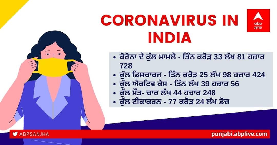 Corona in India: ਭਾਰਤ ਵਿੱਚ ਕੋਰੋਨਾ ਵਾਇਰਸ ਦੇ ਮਾਮਲਿਆਂ ਵਿੱਚ ਵਾਧਾ ਲਗਾਤਾਰ ਤੀਜੇ ਦਿਨ ਜਾਰੀ ਰਿਹਾ। ਪਿਛਲੇ 24 ਘੰਟਿਆਂ ਵਿੱਚ ਦੇਸ਼ ਵਿੱਚ 34 ਹਜ਼ਾਰ 403 ਨਵੇਂ ਮਰੀਜ਼ ਮਿਲੇ ਹਨ। ਨਵੇਂ ਅੰਕੜਿਆਂ ਨੂੰ ਸ਼ਾਮਲ ਕਰਦਿਆਂ, ਦੇਸ਼ ਵਿੱਚ ਕੋਰੋਨਾ ਮਰੀਜ਼ਾਂ ਦੀ ਗਿਣਤੀ 3 ਕਰੋੜ 33 ਲੱਖ 81 ਹਜ਼ਾਰ 629 ਹੋ ਗਈ ਹੈ। ਇਸ ਵੇਲੇ ਦੇਸ਼ ਵਿੱਚ 3 ਲੱਖ 4 ਹਜ਼ਾਰ 973 ਮਰੀਜ਼ਾਂ ਦਾ ਇਲਾਜ ਚੱਲ ਰਿਹਾ ਹੈ ਤੇ ਰਿਕਵਰੀ ਰੇਟ 97.65 ਫੀਸਦੀ ਹੋ ਗਿਆ ਹੈ।