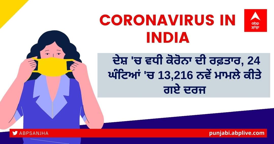 Corona Cases Update: ਦੇਸ਼ ਵਿੱਚ ਕੋਰੋਨਾ ਦੀ ਰਫ਼ਤਾਰ ਵੱਧ ਰਹੀ ਹੈ। ਪਿਛਲੇ 24 ਘੰਟਿਆਂ ਵਿੱਚ 13216 ਨਵੇਂ ਮਾਮਲੇ ਦਰਜ ਕੀਤੇ ਗਏ ਹਨ। ਜੋ ਸ਼ੁੱਕਰਵਾਰ ਨਾਲੋਂ 2.9% ਵੱਧ ਹੈ। ਦੇਸ਼ ਵਿੱਚ ਹੁਣ ਤੱਕ ਕੁੱਲ ਮਾਮਲੇ 4,32,83,793 ਹੋ ਗਏ ਹਨ। ਸਭ ਤੋਂ ਵੱਧ ਮਾਮਲੇ ਮਹਾਰਾਸ਼ਟਰ ਵਿੱਚ ਪਾਏ ਗਏ ਹਨ। ਇੱਥੇ 4,165 ਮਾਮਲੇ ਸੀ। ਇਸ ਤੋਂ ਬਾਅਦ ਕੇਰਲ ਵਿੱਚ 3162, ਦਿੱਲੀ ਵਿੱਚ 1797, ਹਰਿਆਣਾ ਵਿੱਚ 689 ਅਤੇ ਕਰਨਾਟਕ ਵਿੱਚ 634 ਮਾਮਲੇ ਸਾਹਮਣੇ ਆਏ ਹਨ। ਪਿਛਲੇ 24 ਘੰਟਿਆਂ ਵਿੱਚ ਕੁੱਲ 5,19,903 ਨਮੂਨਿਆਂ ਦੀ ਜਾਂਚ ਕੀਤੀ ਗਈ।