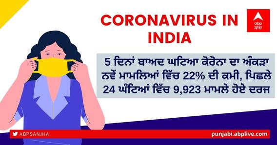 Coronavirus Update in India: ਦੁਨੀਆ ਭਰ 'ਚ ਕੋਰੋਨਾ ਖਿਲਾਫ ਜੰਗ ਅਜੇ ਵੀ ਜਾਰੀ ਹੈ। ਭਾਰਤ ਵਿੱਚ ਵੀ ਪਿਛਲੇ ਕੁਝ ਦਿਨਾਂ ਵਿੱਚ ਕੋਰੋਨਾ ਦੇ ਮਾਮਲਿਆਂ ਵਿੱਚ ਕਾਫੀ ਵਾਧਾ ਹੋਇਆ ਹੈ। ਪਿਛਲੇ 24 ਘੰਟਿਆਂ ਵਿੱਚ ਦੇਸ਼ ਵਿੱਚ ਕੋਵਿਡ-19 ਦੇ 9923 ਨਵੇਂ ਮਾਮਲੇ ਸਾਹਮਣੇ ਆਏ ਹਨ। ਹਾਲਾਂਕਿ ਇਹ ਅੰਕੜਾ ਪਿਛਲੇ ਦਿਨਾਂ ਨਾਲੋਂ ਘੱਟ ਹੈ। ਭਾਰਤ 'ਚ ਪਿਛਲੇ 5 ਦਿਨਾਂ ਤੋਂ ਕੋਰੋਨਾ ਵਾਇਰਸ ਦੇ ਮਾਮਲਿਆਂ 'ਚ ਲਗਾਤਾਰ ਉਛਾਲ ਦੇਖਣ ਨੂੰ ਮਿਲ ਰਿਹਾ ਹੈ ਪਰ ਪਿਛਲੇ 24 ਘੰਟਿਆਂ 'ਚ ਦਰਜ ਕੀਤੇ ਗਏ ਕੋਰੋਨਾ ਦੇ ਨਵੇਂ ਮਾਮਲਿਆਂ 'ਚ ਕਾਫੀ ਗਿਰਾਵਟ ਆਈ ਹੈ।