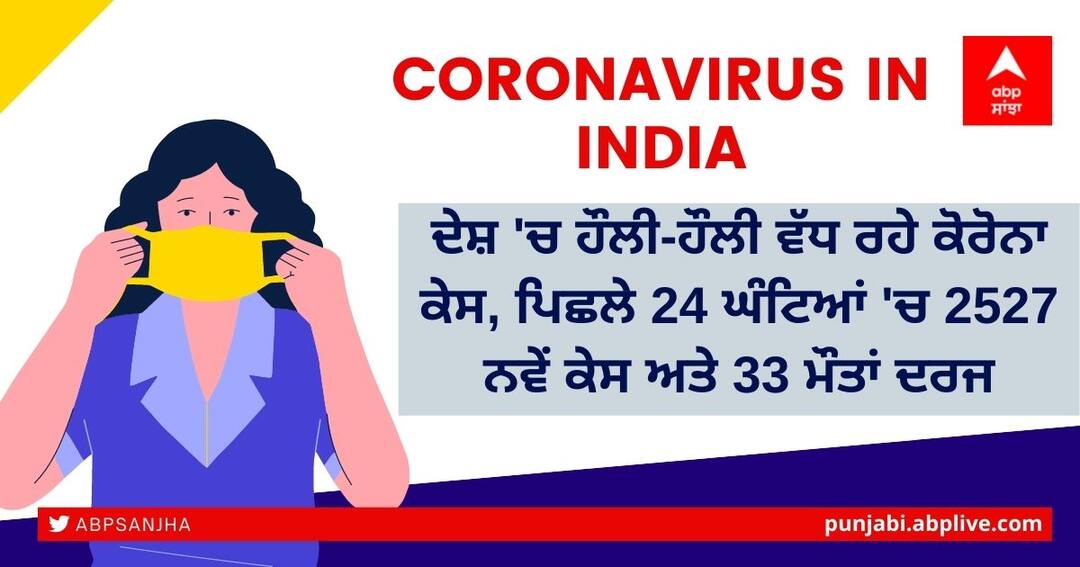 Corona Cases Update Today in India: ਭਾਰਤ 'ਚ ਕੋਰੋਨਾ ਦੇ ਕੇਸਾਂ ਦੀ ਗਿਣਤੀ ਲਗਾਤਾਰ ਵੱਧ ਰਹੀ ਹੈ। ਸ਼ਨੀਵਾਰ ਨੂੰ ਦਿੱਤੀ ਗਈ ਜਾਣਕਾਰੀ ਮੁਤਾਬਕ ਪਿਛਲੇ 24 ਘੰਟਿਆਂ 'ਚ 2527 ਨਵੇਂ ਮਾਮਲੇ ਦਰਜ ਕੀਤੇ ਗਏ ਹਨ। ਇਸ ਕਾਰਨ ਦੇਸ਼ ਵਿੱਚ ਐਕਟਿਵ ਕੇਸਾਂ ਦੀ ਗਿਣਤੀ 15,079 ਹੋ ਗਈ ਹੈ। ਇਹ ਲਗਾਤਾਰ ਚੌਥਾ ਦਿਨ ਹੈ, ਜਦੋਂ ਕੋਰੋਨਾ ਦੇ 2 ਹਜ਼ਾਰ ਤੋਂ ਵੱਧ ਮਾਮਲੇ ਸਾਹਮਣੇ ਆਏ ਹਨ। ਇਸ ਦੇ ਨਾਲ ਹੀ ਦੇਸ਼ 'ਚ ਪੌਜ਼ੇਟੀਵਿਟੀ ਰੇਟ 0.56 ਪ੍ਰਤੀਸ਼ਤ ਬਣੀ ਹੋਈ ਹੈ। ਪਿਛਲੇ 24 ਘੰਟਿਆਂ ਦੌਰਾਨ 33 ਲੋਕਾਂ ਦੀ ਕੋਰੋਨਾ ਕਾਰਨ ਮੌਤ ਹੋਈ ਹੈ।