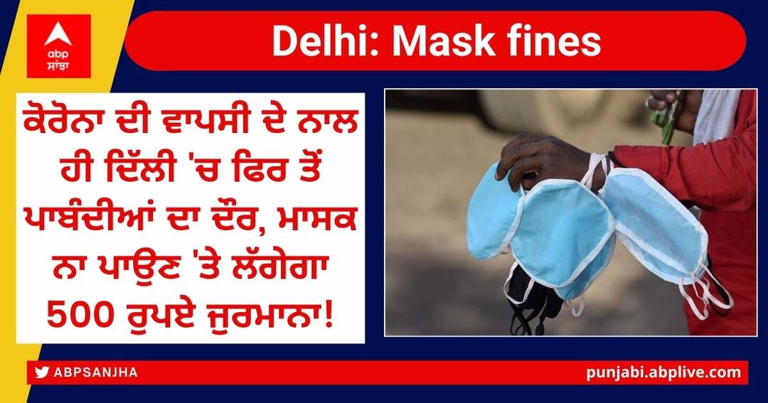 Mask Returns in Delhi: ਦਿੱਲੀ 'ਚ ਕੋਰੋਨਾ ਦੇ ਵਧਦੇ ਮਾਮਲਿਆਂ ਵਿਚਾਲੇ ਇ$ਕ ਵਾਰ ਫਿਰ ਮਾਸਕ ਵਾਪਸ ਆ ਰਿਹਾ ਹੈ। ਬੁੱਧਵਾਰ ਨੂੰ ਹੋਈ ਡੀਡੀਐਮ ਦੀ ਮੀਟਿੰਗ ਵਿੱਚ ਫੈਸਲਾ ਲਿਆ ਗਿਆ ਕਿ ਦਿੱਲੀ ਵਿੱਚ ਮਾਸਕ ਪਹਿਨਣਾ ਲਾਜ਼ਮੀ ਹੋਵੇਗਾ। ਹੁਣ ਦਿੱਲੀ 'ਚ ਮਾਸਕ ਨਾ ਪਾਉਣ 'ਤੇ 500 ਰੁਪਏ ਦਾ ਜ਼ੁਰਮਾਨਾ ਲੱਗੇਗਾ।