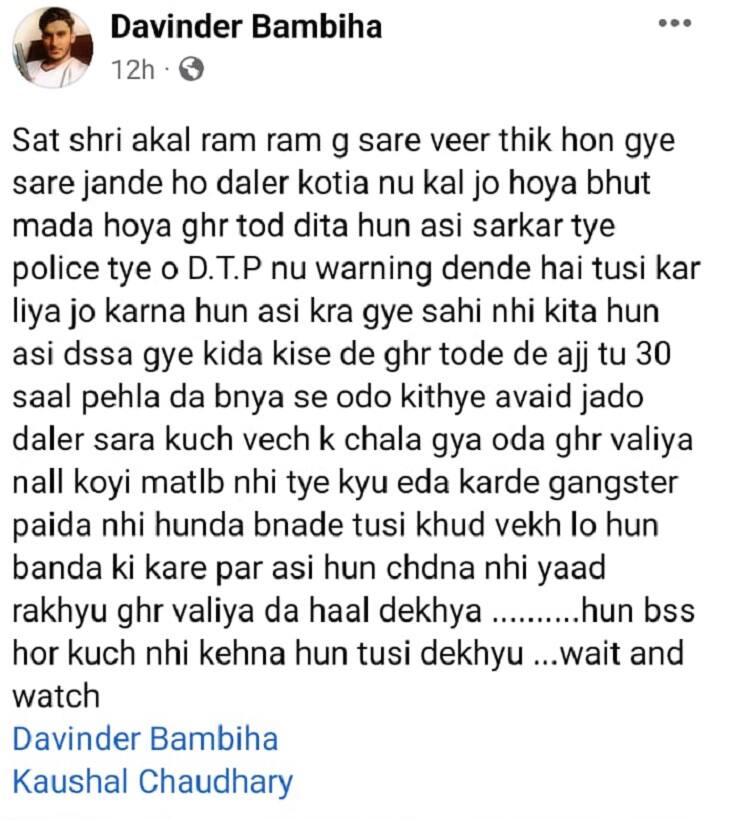 ਬੰਬੀਹਾ ਗਰੁੱਪ ਦੀ ਪੋਸਟ ਵਿੱਚ ਲਿਖਿਆ ਸੀ, ਦਲੇਰ ਦਾ ਘਰ ਤੋੜ ਕੇ ਬਹੁਤ ਮਾੜੀ ਕੀਤੀ, ਹੁਣ ਅਸੀਂ ਪੁਲਿਸ ਤੇ ਸਰਕਾਰ ਨੂੰ ਚੇਤਾਵਨੀ ਦਿੰਦੇ ਹਾਂ ਕਿ ਤੁਸੀਂ ਕਰ ਲਿਆ ਜੋ ਕਰਨਾ ਸੀ ਹੁਣ ਅਸੀਂ ਕਰਾਂਗੇ, ਹੁਣ ਅਸੀਂ ਦੱਸਾਂਗੇ ਕਿ ਕਿਵੇਂ ਕਿਸੇ ਦਾ ਘਰ ਤੋੜੀ ਦਾ, ਇਸ ਤੋਂ ਇਲਾਵਾ ਸਰਕਾਰ ਤੇ ਪ੍ਰਸ਼ਾਸਨ ਨੂੰ ਹੋਰ ਵੀ ਧਮਕੀਆਂ ਦਿੱਤੀਆਂ ਗਈਆਂ ਸੀ