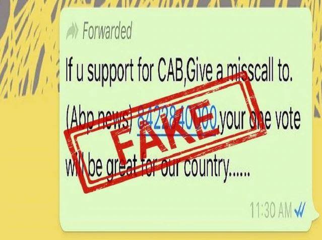 ਨਵੀਂ ਦਿੱਲੀ: ਨਾਗਰਿਕਤਾ ਸੋਧ ਕਾਨੂੰਨ ਨੂੰ ਲੈ ਕੇ ਦੇਸ਼ ਦੇ ਕਈ ਹਿੱਸਿਆਂ ‘ਚ ਲਗਾਤਾਰ ਵਿਰੋਧ ਪ੍ਰਦਰਸ਼ਨ ਹੋ ਰਿਹਾ ਹੈ। ਰਾਜਧਾਨੀ ਦਿੱਲੀ ਸਣੇ ਕਈ ਸੂਬਿਆਂ ‘ਚ ਲੋਕ ਸੜਕਾਂ ‘ਤੇ ਉਤਰੇ ਹੋਏ ਹਨ ਅਤੇ ਪ੍ਰਦਰਸ਼ਨ ਹਿੰਸਕ ਹੋ ਗਿਆ ਹੈ। ਇਸ ਨੂੰ ਲੈ ਕੇ ਪ੍ਰਸਾਸ਼ਨ ਵੱਲੋਂ ਸ਼ਾਂਤੀ ਵਿਵਸਥਾ ਬਣਾਏ ਰੱਖਣ ਦੀ ਅਪੀਲ ਕੀਤੀ ਗਈ ਹੈ। ਇਸੇ ਦੌਰਾਨ ਸੋਸ਼ਲ ਮੀਡੀਆ ‘ਤੇ ਅਪਵਾਹਾਂ ਦਾ ਦੌਰ ਜਾਰੀ ਹੈ। ਸੀਏਏ ਨੂੰ ਲੈ ਜੇ ਕਈ ਤਰ੍ਹਾਂ ਦੇ ਫੇਕ ਮੈਸੇਜ ਵੀ ਵਾਇਰਲ ਹੋ ਰਹੇ ਹਨ। ਅਜਿਹਾ ਹੀ ਇੱਕ ਫੇਕ ਮੈਸੇਜ ਤੁਹਾਨੂੰ ਏਬੀਪੀ ਨਿਊਜ਼ ਦੇ ਨਾਂ ਨਾਲ ਵੀ ਸੋਸ਼ਲ ਮੀਡੀਆ ‘ਤੇ ਫੈਲਦਾ ਮਿਲੇਗਾ। ਇਸ ਮੈਸੇਜ 'ਚ ਏਬੀਪੀ ਨਿਊਜ਼ ਦੇ ਹਵਾਲੇ ਨਾਲ ਕਿਹਾ ਗਿਆ ਹੈ, “ਜੇ ਤੁਸੀਂ ਸੀਏਬੀ ਦਾ ਸਮਰਥਨ ਕਰਦੇ ਹੋ ਤਾਂ 8422840000 'ਤੇ ਮਿਸਡ ਕਾਲ ਦਿਓ। ਤੁਹਾਡੀ ਵੋਟ ਸਾਡੇ ਲਈ ਮਹੱਤਵਪੂਰਣ ਹੈ।” ਵਾਇਰਲ ਸੰਦੇਸ਼ 'ਚ ਦਿੱਤਾ ਗਿਆ ਨੰਬਰ ਏਬੀਪੀ ਨਿਊਜ਼ ਦੇ ਸਭ ਤੋਂ ਮਸ਼ਹੂਰ ਸ਼ੋਅ ‘ਘੰਟੀ ਬਜਾਓ ’ਦਾ ਹੈ। ਦੱਸ ਦੇਈਏ ਕਿ ਵਾਇਰਲ ਸੰਦੇਸ਼ 'ਚ ਦਾਅਵਾ ਪੂਰੀ ਤਰ੍ਹਾਂ ਬੇਬੁਨਿਆਦ ਅਤੇ ਝੂਠਾ ਹੈ। ਏਬੀਪੀ ਨਿਊਜ਼ ਅਜਿਹੀ ਕੋਈ ਮੁਹਿੰਮ ਨਹੀਂ ਚਲਾ ਰਿਹਾ। ਜੇ ਤੁਹਾਨੂੰ ਕੋਈ ਅਜਿਹਾ ਸੰਦੇਸ਼ ਮਿਲਦਾ ਹੈ, ਤਾਂ ਇਸ ਨੂੰ ਪੂਰੀ ਤਰ੍ਹਾਂ ਨਜ਼ਰ ਅੰਦਾਜ਼ ਕਰੋ।