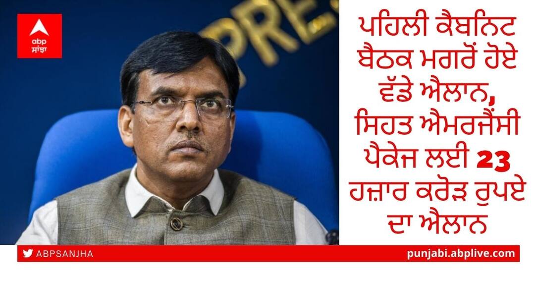 ਨਵੀਂ ਦਿੱਲੀ: ਮੋਦੀ ਮੰਤਰੀ ਮੰਡਲ ਦੇ ਵਿਸਥਾਰ ਅਤੇ ਤਬਦੀਲੀ ਤੋਂ ਬਾਅਦ ਵੀਰਵਾਰ ਸ਼ਾਮ ਨੂੰ ਮੰਤਰੀ ਮੰਡਲ ਦੀ ਪਹਿਲੀ ਬੈਠਕ ਹੋਈ। ਵੀਡੀਓ ਕਾਨਫਰੰਸਿੰਗ ਰਾਹੀਂ ਹੋਈ ਮੀਟਿੰਗ ਵਿੱਚ ਕਿਸਾਨਾਂ, ਕੋਰੋਨਾ ਆਦਿ ਦੇ ਮੁੱਦੇ ‘ਤੇ ਅਹਿਮ ਫੈਸਲੇ ਲਏ ਗਏ। ਕੋਰੋਨਾ ਖਿਲਾਫ ਲੜਾਈ ਲਈ 23100 ਕਰੋੜ ਦੇ ਐਮਰਜੈਂਸੀ ਸਿਹਤ ਪੈਕੇਜ ਦਾ ਐਲਾਨ ਕੀਤਾ ਗਿਆ। ਇਸ ਤੋਂ ਇਲਾਵਾ ਮੰਡੀ ਜ਼ਰੀਏ ਇਕ ਲੱਖ ਕਰੋੜ ਰੁਪਏ ਕਿਸਾਨਾਂ ਨੂੰ ਪਹੁੰਚਾਏ ਜਾਣਗੇ। ਮੰਤਰੀ ਮੰਡਲ ਦੀ ਬੈਠਕ ਖ਼ਤਮ ਹੋਣ ਤੋਂ ਬਾਅਦ ਕੇਂਦਰੀ ਮੰਤਰੀ ਅਨੁਰਾਗ ਠਾਕੁਰ, ਮਨਸੁਖ ਮੰਡਵੀਆ, ਨਰਿੰਦਰ ਸਿੰਘ ਤੋਮਰ ਨੇ ਇਹ ਜਾਣਕਾਰੀ ਦਿੱਤੀ।
