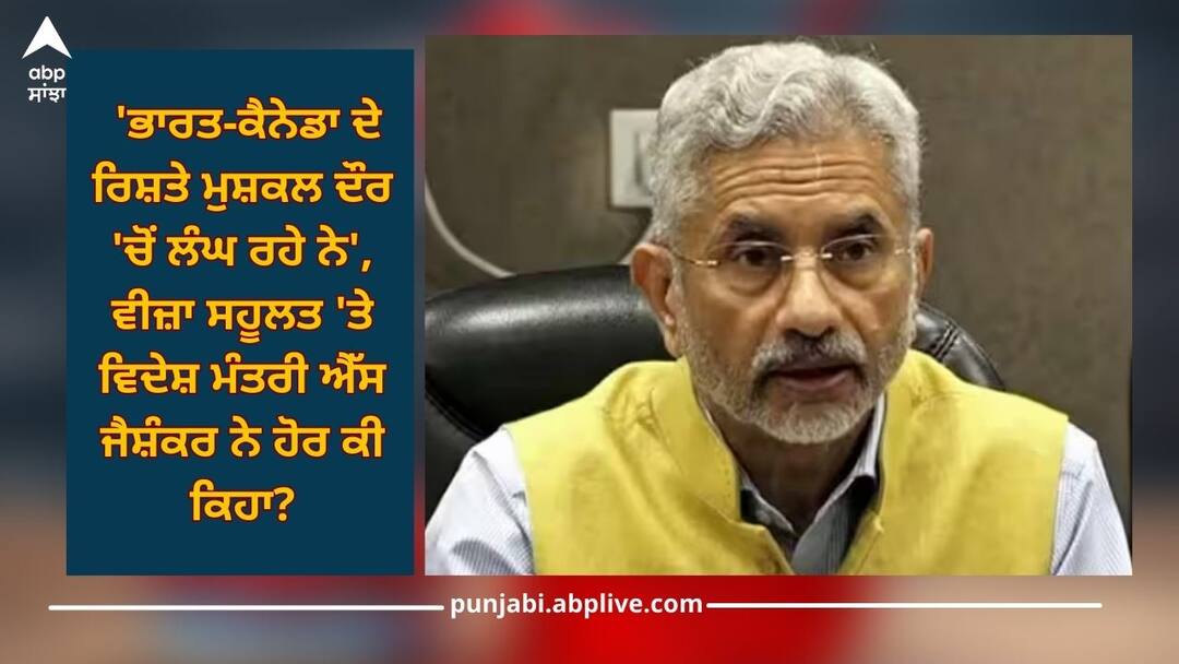 S Jaishankar on India-Canada Dispute: ਇਸ ਸਮੇਂ ਭਾਰਤ ਅਤੇ ਕੈਨੇਡਾ ਦੇ ਰਿਸ਼ਤਿਆਂ ਵਿੱਚ ਦਰਾੜ ਪਈ ਹੋਈ ਨਜ਼ਰ ਆ ਰਹੀ ਹੈ। ਦੋਵਾਂ ਦਾ ਰਿਸ਼ਤਾ ਕਾਫੀ ਮੁਸ਼ਕਲ ਦੌਰ 'ਚੋਂ ਲੰਘ ਰਿਹਾ ਹੈ। ਇਸ ਸਮੇਂ ਲੋਕਾਂ ਦੀ ਸਭ ਤੋਂ ਵੱਡੀ ਚਿੰਤਾ ਵੀਜ਼ਾ ਬੰਦ ਹੋਣ ਨੂੰ ਲੈ ਕੇ ਹੈ। ਭਾਰਤ ਸਰਕਾਰ ਇਸ ਮਾਮਲੇ 'ਤੇ ਤਿੱਖੀ ਨਜ਼ਰ ਰੱਖ ਰਹੀ ਹੈ। ਸਥਿਤੀ ਵਿੱਚ ਸੁਧਾਰ ਹੁੰਦੇ ਹੀ ਵੀਜ਼ਾ ਮੁੜ ਚਾਲੂ ਕਰ ਦਿੱਤਾ ਜਾਵੇਗਾ। ਦੋਵਾਂ ਦੇਸ਼ਾਂ ਵਿਚਾਲੇ ਚੱਲ ਰਹੇ ਤਣਾਅ ਦਰਮਿਆਨ ਵਿਦੇਸ਼ ਮੰਤਰੀ ਡਾ. ਐੱਸ. ਜੈਸ਼ੰਕਰ ਨੇ ਇਹ ਗੱਲ ਕਹੀ।