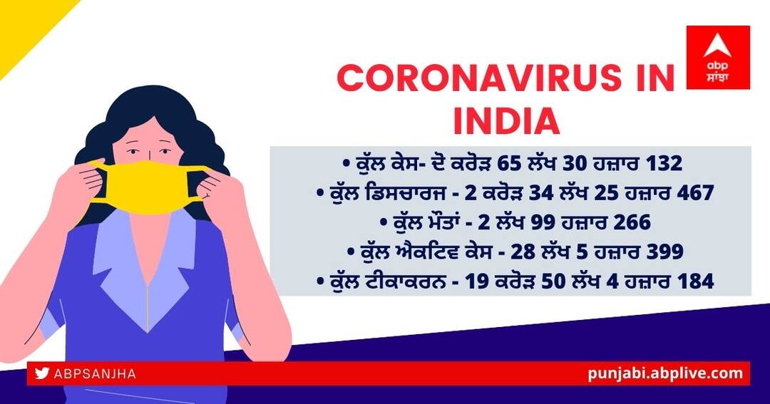 Corona-Virus Cases Today in India: ਦੇਸ਼ ’ਚ ਕੋਰੋਨਾਵਾਇਰਸ ਦੀ ਮਹਾਮਾਰੀ ਦੇ ਨਵੇਂ ਮਾਮਲਿਆਂ ਵਿੱਚ ਹੁਣ ਗਿਰਾਵਟ ਦਰਜ ਕੀਤੀ ਜਾ ਰਹੀ ਹੈ। ਪਿਛਲੇ 24 ਘੰਟਿਆਂ ਵਿੱਚ ਦੇਸ਼ ਵਿੱਚ ਕੋਰੋਨਾ ਦੇ 2 ਲੱਖ 40 ਹਜ਼ਾਰ 842 ਨਵੇਂ ਕੇਸ ਸਾਹਮਣੇ ਆਏ ਹਨ। ਭਾਵੇਂ ਕੱਲ੍ਹ 3741 ਲੋਕਾਂ ਦੀ ਮੌਤ ਹੋ ਗਈ ਸੀ। ਕੱਲ੍ਹ ਤਿੰਨ ਲੱਖ 55 ਹਜ਼ਾਰ 102 ਵਿਅਕਤੀ ਠੀਕ ਹੋ ਗਏ। ਜਾਣੋ ਦੇਸ਼ ਵਿਚ ਕੋਰੋਨਾ ਦੇ ਤਾਜ਼ਾ ਅੰਕੜੇ: • ਕੁੱਲ ਕੇਸ- ਦੋ ਕਰੋੜ 65 ਲੱਖ 30 ਹਜ਼ਾਰ 132• ਕੁੱਲ ਡਿਸਚਾਰਜ - 2 ਕਰੋੜ 34 ਲੱਖ 25 ਹਜ਼ਾਰ 467• ਕੁੱਲ ਮੌਤਾਂ - 2 ਲੱਖ 99 ਹਜ਼ਾਰ 266• ਕੁੱਲ ਐਕਟਿਵ ਕੇਸ - 28 ਲੱਖ 5 ਹਜ਼ਾਰ 399• ਕੁੱਲ ਟੀਕਾਕਰਨ - 19 ਕਰੋੜ 50 ਲੱਖ 4 ਹਜ਼ਾਰ 184