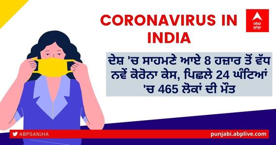 Coronavirus in India: ਕੱਲ੍ਹ ਦੇ ਮੁਕਾਬਲੇ ਅੱਜ ਕੋਰੋਨਾ ਸੰਕਰਮਣ ਦੇ ਨਵੇਂ ਮਾਮਲਿਆਂ ਵਿੱਚ ਕੁਝ ਕਮੀ ਆਈ ਹੈ। ਦੇਸ਼ 'ਚ ਪਿਛਲੇ 24 ਘੰਟਿਆਂ ਦੌਰਾਨ 8 ਹਜ਼ਾਰ 318 ਨਵੇਂ ਮਾਮਲੇ ਸਾਹਮਣੇ ਆਏ ਹਨ ਜਦਕਿ 465 ਲੋਕਾਂ ਦੀ ਮੌਤ ਹੋ ਗਈ ਹੈ। ਇਸ ਦੇ ਨਾਲ ਹੀ ਇਸ ਦੌਰਾਨ 10 ਹਜ਼ਾਰ 967 ਕੋਰੋਨਾ ਮਰੀਜ਼ ਠੀਕ ਹੋ ਚੁੱਕੇ ਹਨ।