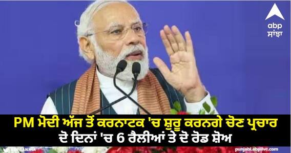 PM ਮੋਦੀ ਸ਼ਨੀਵਾਰ (29 ਅਪ੍ਰੈਲ) ਨੂੰ ਦੋ ਦਿਨਾਂ ਦੌਰੇ 'ਤੇ ਕਰਨਾਟਕ ਪਹੁੰਚ ਰਹੇ ਹਨ। ਪ੍ਰਧਾਨ ਮੰਤਰੀ ਆਪਣੇ ਪ੍ਰੋਗਰਾਮ ਮੁਤਾਬਕ ਸ਼ਨੀਵਾਰ ਸਵੇਰੇ 11 ਵਜੇ ਹਮਨਾਬਾਦ ਪਹੁੰਚਣਗੇ। ਫਿਰ ਦੁਪਹਿਰ 1 ਵਜੇ ਵਿਜੇਪੁਰਾ ਅਤੇ ਦੁਪਹਿਰ 2.45 ਵਜੇ ਕੁਡਾਚੀ ਵਿਖੇ ਰੈਲੀ ਨੂੰ ਸੰਬੋਧਨ ਕਰਨਗੇ। ਇਨ੍ਹਾਂ ਰੈਲੀਆਂ ਤੋਂ ਬਾਅਦ ਪੀਐਮ ਮੋਦੀ ਸ਼ਾਮ ਨੂੰ ਬੈਂਗਲੁਰੂ ਜਾਣਗੇ, ਜਿੱਥੇ ਉਹ ਇੱਕ ਮੈਗਾ ਰੋਡ ਸ਼ੋਅ ਕਰਨਗੇ।