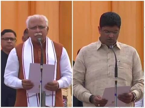 ਚੰਡੀਗੜ੍ਹ: ਹਰਿਆਣਾ ਵਿਧਾਨ ਸਭਾ ਚੋਣਾਂ ਤੋਂ ਬਾਅਦ ਮਨੋਹਰ ਲਾਲ ਖੱਟਰ ਨੇ ਇੱਕ ਵਾਰ ਫਿਰ ਸੂਬੇ ਦੇ ਮੁੱਖ ਮੰਤਰੀ ਵਜੋਂ ਸਹੁੰ ਚੁੱਕੀ। ਉਨ੍ਹਾਂ ਦੇ ਨਾਲ ਹੀ ਦੁਸ਼ਯੰਤ ਚੌਟਾਲਾ ਨੂੰ ਹਰਿਆਣਾ ਦੇ ਰਾਜਪਾਲ ਸੱਤਿਆਦੇਵ ਨਾਰਾਇਣ ਆਰੀਆ ਨੇ ਉਪ ਮੁੱਖ ਮੰਤਰੀ ਵਜੋਂ ਸਹੁੰ ਵੀ ਚੁਕਾਈ।