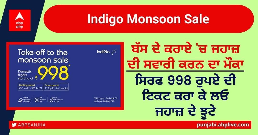 ਨਵੀਂ ਦਿੱਲੀ: ਬੱਸ ਦੇ ਕਰਾਏ 'ਚ ਜਹਾਜ਼ ਦੀ ਸਵਾਰੀ ਕਰਨ ਦਾ ਮੌਕਾ ਮਿਲ ਰਿਹਾ ਹੈ। ਸਿਰਫ 998 ਰੁਪਏ ਦੀ ਟਿਕਟ ਕਰਾ ਕੇ ਜਹਾਜ਼ ਦੀ ਝੂਟੇ ਲੈ ਸਕਦੇ ਹੋ। Domestic Carrier IndiGo ਨੇ ਯਾਤਰੀਆਂ ਲਈ ਮਾਨਸੂਨ ਸੇਲ ਆਫਰ ਪੇਸ਼ ਕੀਤਾ ਹੈ। ਏਅਰਲਾਈਨ ਮਾਨਸੂਨ ਵਿੱਚ ਘੱਟ ਕਿਰਾਏ 'ਤੇ ਟਿਕਟਾਂ ਵੇਚ ਰਹੀ ਹੈ। ਇਹ ਆਫਰ 25 ਜੂਨ ਤੋਂ ਸ਼ੁਰੂ ਹੋ ਰਹੀ ਹੈ ਅਤੇ 30 ਜੂਨ, 2021 ਤੱਕ ਰਹੇਗੀ।