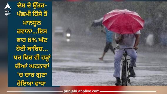 Monsoon ends: ਦੇਸ਼ ਦੇ ਉੱਤਰ-ਪੱਛਮੀ ਹਿੱਸੇ ਤੋਂ ਮਾਨਸੂਨ ਰਵਾਨਾ ਹੋ ਗਿਆ ਹੈ। ਇਹ ਵਿਦਾਈ 25 ਸਤੰਬਰ ਤੋਂ ਸ਼ੁਰੂ ਹੋਈ ਅਤੇ 30 ਸਤੰਬਰ ਤੱਕ ਪੂਰੇ ਪੰਜਾਬ, ਹਰਿਆਣਾ, ਦਿੱਲੀ ਦੇ ਨਾਲ-ਨਾਲ ਜੰਮੂ-ਕਸ਼ਮੀਰ, ਹਿਮਾਚਲ, ਉੱਤਰਾਖੰਡ, ਉੱਤਰ ਪ੍ਰਦੇਸ਼, ਮੱਧ ਪ੍ਰਦੇਸ਼ ਅਤੇ ਰਾਜਸਥਾਨ ਨੂੰ ਵਿਦਾਇਗੀ ਦਿੱਤੀ ਗਈ। ਲਗਾਤਾਰ 4 ਸਾਲ ਆਮ ਜਾਂ ਜ਼ਿਆਦਾ ਬਾਰਿਸ਼ ਹੋਣ ਤੋਂ ਬਾਅਦ ਇਸ ਵਾਰ ਮਾਨਸੂਨ 6 ਫੀਸਦੀ ਘੱਟ ਬਾਰਿਸ਼ ਨਾਲ ਖਤਮ ਹੋਇਆ ਹੈ। ਹਾਲਾਂਕਿ, ਐਲ ਨੀਨੋ ਦੇ ਬਾਵਜੂਦ, ਇਸ ਮਾਨਸੂਨ ਵਿੱਚ 94% ਬਾਰਿਸ਼ ਹੋਈ।ਮਾਹਿਰਾਂ ਦਾ ਕਹਿਣਾ ਹੈ ਕਿ ਐਲ ਨੀਨੋ ਦੌਰਾਨ ਆਮ ਤੌਰ 'ਤੇ ਸੋਕਾ ਹੁੰਦਾ ਹੈ ਜਾਂ ਦੂਜੇ ਸ਼ਬਦਾਂ ਵਿਚ 10 ਤੋਂ 25 ਫੀਸਦੀ ਘੱਟ ਬਾਰਿਸ਼ ਦਰਜ ਕੀਤੀ ਜਾਂਦੀ ਹੈ।