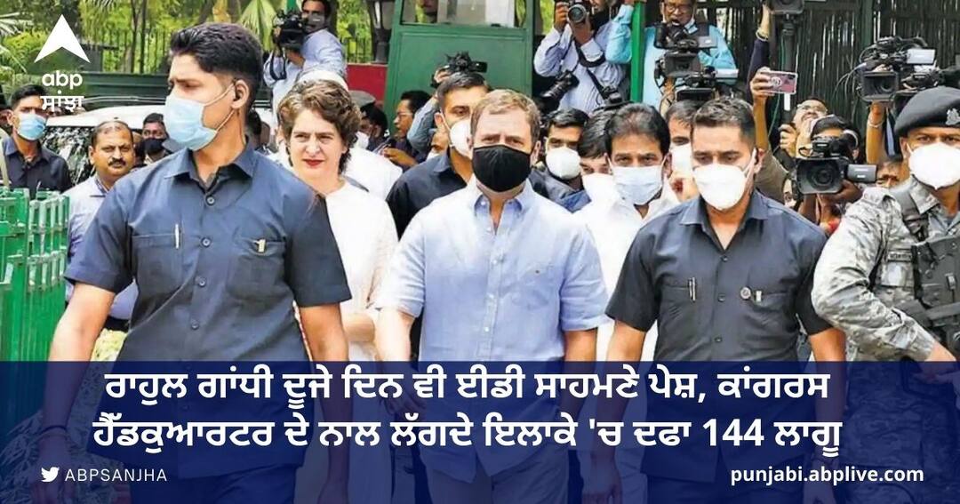 ਦੂਜੇ ਪਾਸੇ ਸੋਮਵਾਰ ਦੀ ਤਰ੍ਹਾਂ ਮੰਗਲਵਾਰ ਨੂੰ ਵੀ ਰਾਹੁਲ ਗਾਂਧੀ ਦੀ ਪੇਸ਼ੀ 'ਤੇ ਕਾਂਗਰਸੀ ਨੇਤਾਵਾਂ ਤੇ ਵਰਕਰਾਂ ਨੇ ਪ੍ਰਦਰਸ਼ਨ ਕੀਤਾ ਤੇ ਕਈ ਲੋਕਾਂ ਨੂੰ ਪੁਲਿਸ ਨੇ ਹਿਰਾਸਤ 'ਚ ਲੈ ਲਿਆ। ਪੁਲਿਸ ਨੇ ਕਾਂਗਰਸ ਹੈੱਡਕੁਆਰਟਰ ਦੇ ਨਾਲ ਲੱਗਦੇ ਇਲਾਕੇ 'ਚ ਧਾਰਾ 144 ਲਗਾ ਦਿੱਤੀ ਹੈ। ਇਸ ਦੌਰਾਨ ਰਾਹੁਲ ਗਾਂਧੀ ਤੋਂ ਈਡੀ ਦੀ ਪੁੱਛ ਪੜਤਾਲ ਖ਼ਿਲਾਫ਼ ਦੂਜੇ ਦਿਨ ਵੀ ਕਾਂਗਰਸ ਨੇਤਾਵਾਂ ਤੇ ਵਰਕਰਾਂ ਨੇ ਵਿਰੋਧ ਪ੍ਰਦਰਸ਼ਨ ਕੀਤਾ, ਜਿਸ ਤੋਂ ਬਾਅਦ ਪੁਲੀਸ ਨੇ ਕਈ ਵਿਅਕਤੀਆਂ ਨੂੰ ਹਿਰਾਸਤ ਵਿੱਚ ਲੈ ਲਿਆ।
