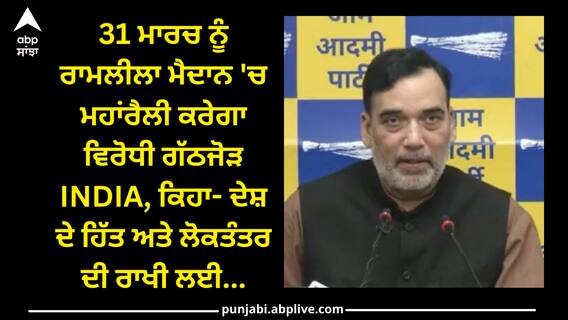 Delhi news: ਆਮ ਆਦਮੀ ਪਾਰਟੀ ਦੇ ਆਗੂ ਗੋਪਾਲ ਰਾਏ ਨੇ ਐਤਵਾਰ ਨੂੰ ਕਿਹਾ ਕਿ ਵਿਰੋਧੀ ਧਿਰ ਦਾ ਗਠਜੋੜ ‘INDIA’, ਦੇਸ਼ ਦੇ ਹਿੱਤਾਂ ਅਤੇ ਲੋਕਤੰਤਰ ਦੀ ਰਾਖੀ ਲਈ 31 ਮਾਰਚ ਨੂੰ ਦਿੱਲੀ ਦੇ ਰਾਮਲੀਲਾ ਮੈਦਾਨ ਵਿੱਚ ਮਹਾਂਰੈਲੀ ਕਰੇਗਾ। ਦੱਸ ਦਈਏ ਇੰਡੀਅਨ ਨੈਸ਼ਨਲ ਡਿਵੈਲਪਮੈਂਟਲ ਇਨਕਲੂਸਿਵ ਅਲਾਇੰਸ (INDIA) ਦੇ ਹਿੱਸੇ 'ਆਪ' ਅਤੇ ਕਾਂਗਰਸ ਨੇ ਇੱਥੇ ਇੱਕ ਪ੍ਰੈਸ ਕਾਨਫਰੰਸ ਵਿੱਚ ਰੈਲੀ ਦਾ ਐਲਾਨ ਕੀਤਾ।