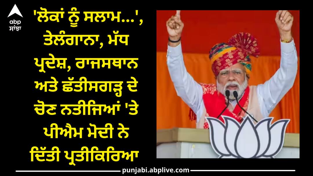 PM Modi On Assembly Election Result 2023: ਪ੍ਰਧਾਨ ਮੰਤਰੀ ਨਰਿੰਦਰ ਮੋਦੀ ਨੇ ਐਤਵਾਰ (3 ਦਸੰਬਰ) ਨੂੰ ਰਾਜਸਥਾਨ, ਮੱਧ ਪ੍ਰਦੇਸ਼ ਅਤੇ ਤੇਲੰਗਾਨਾ ਵਿਧਾਨ ਸਭਾ ਚੋਣਾਂ ਦੇ ਨਤੀਜਿਆਂ 'ਤੇ ਆਪਣੀ ਪਹਿਲੀ ਪ੍ਰਤੀਕਿਰਿਆ ਦਿੱਤੀ।
