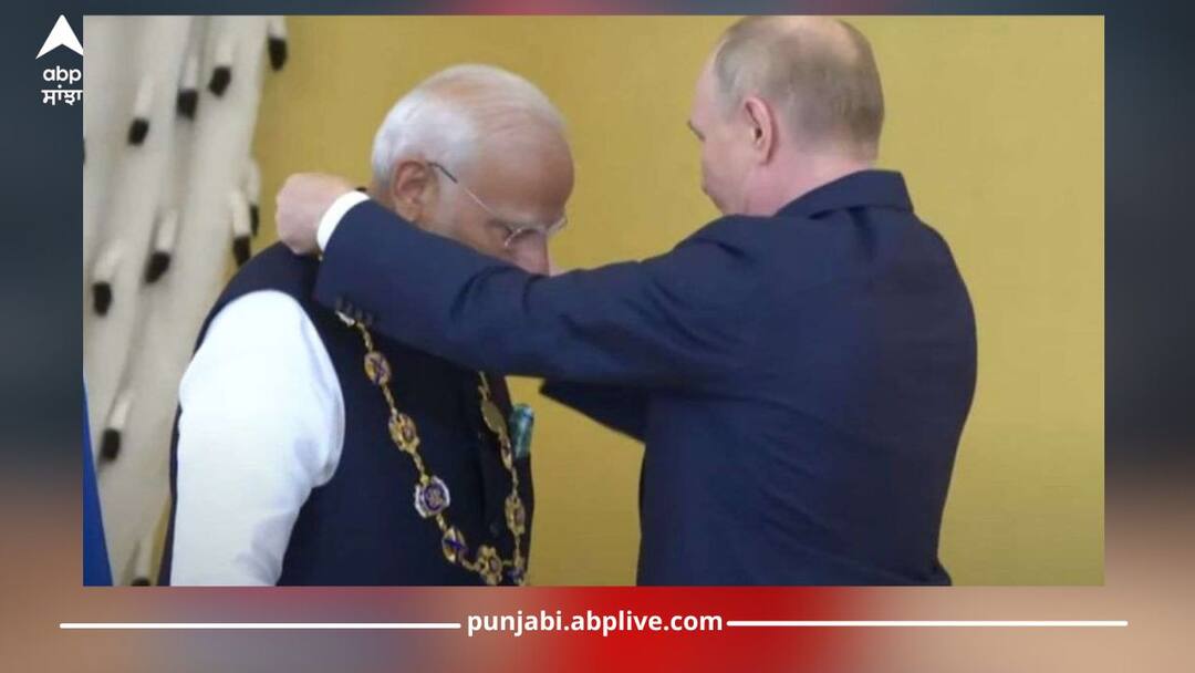 PM Modi receives Russia's highest civilian honour: ਪ੍ਰਧਾਨ ਮੰਤਰੀ ਨਰਿੰਦਰ ਮੋਦੀ ਰੂਸ ਦੇ ਦੋ ਦਿਨਾਂ ਦੌਰੇ 'ਤੇ ਹਨ। ਇਸ ਦੌਰਾਨ ਪ੍ਰਧਾਨ ਮੰਤਰੀ ਨਰਿੰਦਰ ਮੋਦੀ ਨੂੰ ਰੂਸ ਦੇ ਸਰਵਉੱਚ ਨਾਗਰਿਕ ਸਨਮਾਨ 'ਆਰਡਰ ਆਫ਼ ਸੇਂਟ ਐਂਡਰਿਊ ਦਿ ਅਪੋਸਲ' ਨਾਲ ਸਨਮਾਨਿਤ ਕੀਤਾ ਗਿਆ। ਪੀਐਮ ਮੋਦੀ ਨੂੰ ਇਹ ਸਨਮਾਨ ਰੂਸ ਦੇ ਰਾਸ਼ਟਰਪਤੀ ਵਲਾਦੀਮੀਰ ਪੁਤਿਨ ਨੇ ਦਿੱਤਾ ਹੈ। ਪੀਐਮ ਮੋਦੀ ਨੇ ਇਸ ਸਨਮਾਨ ਨੂੰ ਭਾਰਤ ਦੇ 140 ਕਰੋੜ ਲੋਕਾਂ ਦਾ ਸਨਮਾਨ ਦੱਸਿਆ ਹੈ।