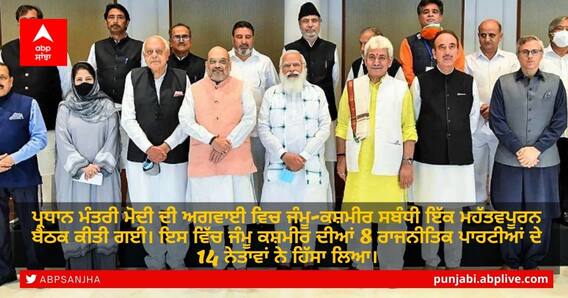 - ਜੰਮੂ-ਕਸ਼ਮੀਰ ਦੇ ਚਾਰ ਸਾਬਕਾ ਮੁੱਖ ਮੰਤਰੀਆਂ ਸਮੇਤ ਅੱਠ ਮੁੱਖ ਧਾਰਾ ਦੀਆਂ ਰਾਜਨੀਤਿਕ ਪਾਰਟੀਆਂ ਦੇ 14 ਨੇਤਾਵਾਂ ਨੇ ਸੂਬੇ ਵਿੱਚ ਰਾਜਨੀਤਿਕ ਪ੍ਰਕਿਰਿਆ ਸਥਾਪਤ ਕਰਨ ਦੇ ਉਦੇਸ਼ ਨਾਲ ਮੀਟਿੰਗ ਵਿੱਚ ਹਿੱਸਾ ਲਿਆ। ਰਾਜ ਸਾਲ 2018 ਤੋਂ ਰਾਸ਼ਟਰਪਤੀ ਸ਼ਾਸਨ ਦੇ ਅਧੀਨ ਹੈ, ਜਦੋਂ ਭਾਜਪਾ ਨੇ ਤਤਕਾਲੀ ਮੁੱਖ ਮੰਤਰੀ ਮਹਿਬੂਬਾ ਮੁਫਤੀ ਸਰਕਾਰ ਦਾ ਸਮਰਥਨ ਵਾਪਸ ਲੈ ਲਿਆ ਸੀ।
