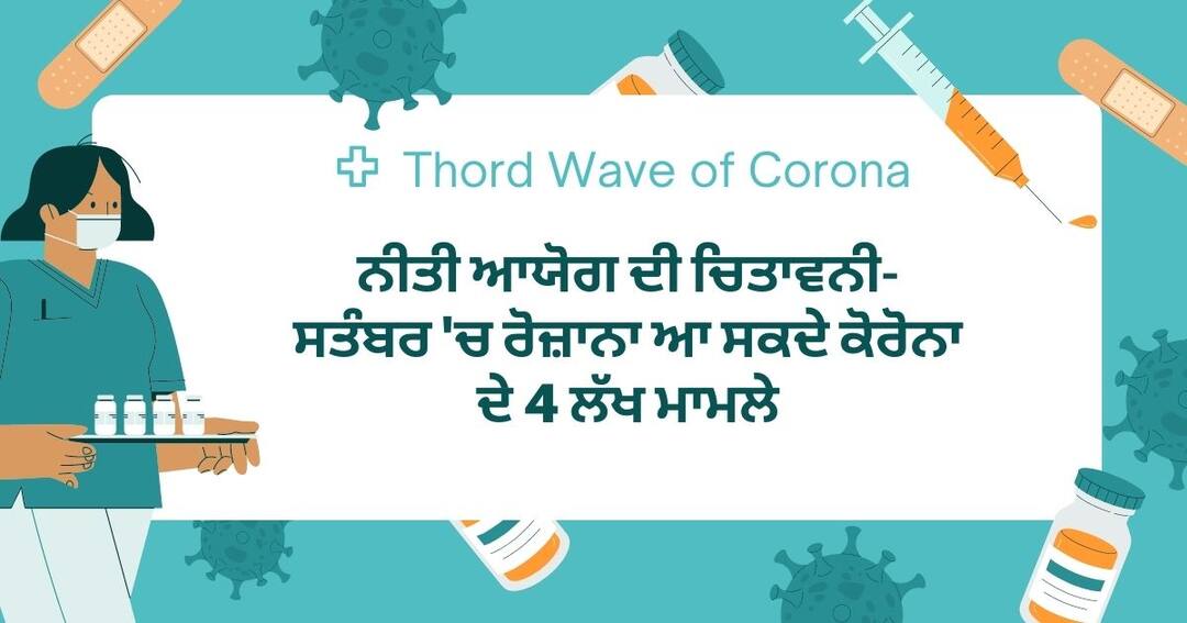 ਨਵੀਂ ਦਿੱਲੀ: ਕੋਵਿਡ ਮਹਾਂਮਾਰੀ ਦਾ ਭਿਆਨਕ ਰੂਪ ਭਾਰਤ ਵਿੱਚ ਇੱਕ ਵਾਰ ਫਿਰ ਵੇਖਿਆ ਜਾ ਸਕਦਾ ਹੈ। ਨੀਤੀ ਆਯੋਗ ਨੇ ਕੋਰੋਨਾ ਦੀ ਤੀਜੀ ਲਹਿਰ ਬਾਰੇ ਚਿਤਾਵਨੀ ਜਾਰੀ ਕੀਤੀ ਹੈ। ਕਮਿਸ਼ਨ ਨੂੰ ਡਰ ਹੈ ਕਿ ਸਤੰਬਰ ਵਿੱਚ ਰੋਜ਼ਾਨਾ 4 ਤੋਂ 5 ਲੱਖ ਕੋਰੋਨਾ ਦੇ ਮਾਮਲੇ ਆ ਸਕਦੇ ਹਨ। ਹਰ 100 ਕੋਰੋਨਾ ਮਾਮਲਿਆਂ ਚੋਂ 23 ਕੇਸਾਂ ਦੇ ਹਸਪਤਾਲ ਵਿੱਚ ਭਰਤੀ ਹੋਣ ਦੀ ਵਿਵਸਥਾ ਕਰਨੀ ਪੈ ਸਕਦੀ ਹੈ। ਅਜਿਹੀ ਸਥਿਤੀ ਵਿੱਚ ਦੋ ਲੱਖ ਆਈਸੀਯੂ ਬਿਸਤਰੇ ਪਹਿਲਾਂ ਤੋਂ ਤਿਆਰ ਰੱਖਣ ਦੀ ਜ਼ਰੂਰਤ ਹੈ।