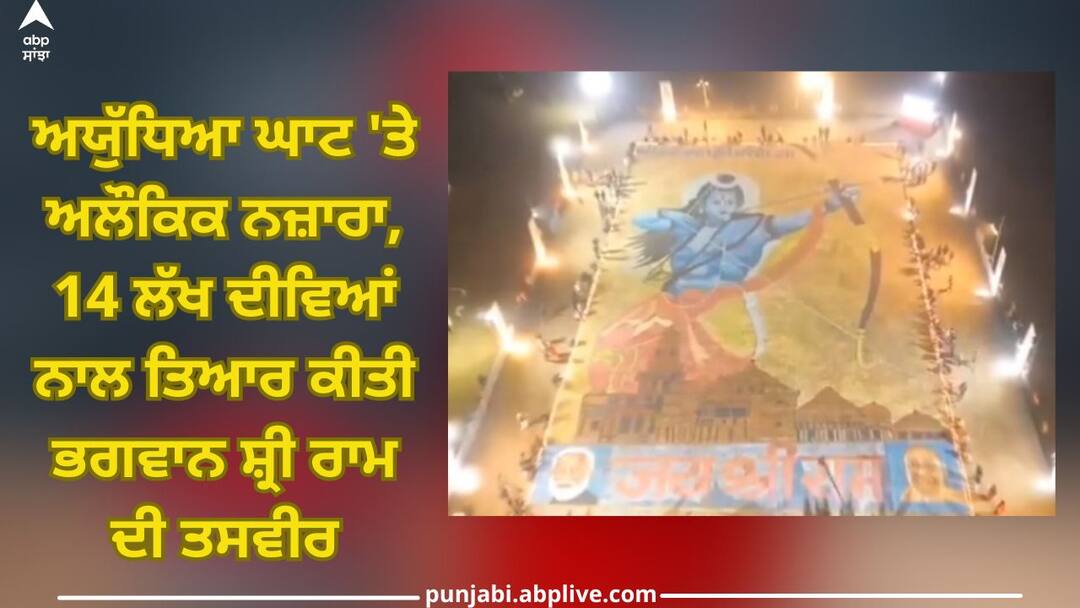Image of Lord Shri Ram made with14 lakh diyas: 22 ਜਨਵਰੀ ਨੂੰ ਅਯੁੱਧਿਆ ਵਿੱਚ ਰਾਮ ਮੰਦਰ ਦੇ ਉਦਘਾਟਨ ਤੋਂ ਪਹਿਲਾਂ ਸਾਕੇਤ ਮਹਾਵਿਦਿਆਲਿਆ ਵਿੱਚ ਮੋਜ਼ੇਕ ਕਲਾਕਾਰ ਅਨਿਲ ਕੁਮਾਰ ਦੁਆਰਾ 14 ਲੱਖ ਦੀਵੇ ਦੀ ਵਰਤੋਂ ਕਰਕੇ ਭਗਵਾਨ ਰਾਮ (Lord Shri Ram) ਦੀ ਇੱਕ ਵੱਡੀ ਤਸਵੀਰ ਬਣਾਈ ਗਈ ਹੈ। ਬੇਹੱਦ ਅਲੌਕਿਕ ਨਜ਼ਾਰੇ ਵਾਲਾ ਇਹ ਪਲ ਕੈਮਰੇ ਦੇ ਵਿੱਚ ਕੈਦ ਹੋ ਗਿਆ, ਜਿਸ ਦਾ ਵੀਡੀਓ ਹੁਣ ਸੋਸ਼ਲ ਮੀਡੀਆ ਉੱਤੇ ਵੀ ਖੂਬ ਵਾਇਰਲ ਹੋ ਰਿਹਾ ਹੈ।