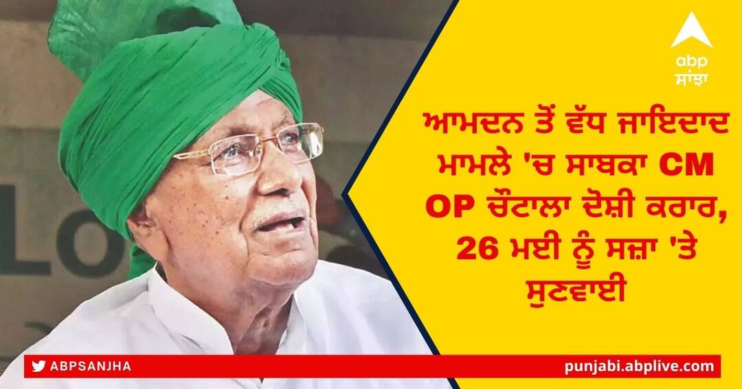 OP Chautala Convicted: ਹਰਿਆਣਾ ਦੇ ਸਾਬਕਾ ਮੁੱਖ ਮੰਤਰੀ ਓਮ ਪ੍ਰਕਾਸ਼ ਚੌਟਾਲਾ ਨੂੰ ਆਮਦਨ ਤੋਂ ਵੱਧ ਜਾਇਦਾਦ ਦੇ ਮਾਮਲੇ ਵਿੱਚ ਦਿੱਲੀ ਦੀ ਰਾਉਸ ਐਵੇਨਿਊ ਅਦਾਲਤ ਨੇ ਦੋਸ਼ੀ ਕਰਾਰ ਦਿੱਤਾ ਹੈ। ਸ਼ਨੀਵਾਰ ਨੂੰ ਸੁਣਵਾਈ ਦੌਰਾਨ ਓਮ ਪ੍ਰਕਾਸ਼ ਚੌਟਾਲਾ ਕੋਰਟ ਰੂਮ 'ਚ ਮੌਜੂਦ ਸੀ। ਅਦਾਲਤ 'ਚ 26 ਮਈ ਨੂੰ ਸਾਬਕਾ ਸੀ.ਐੱਮ ਦੀ ਸਜ਼ਾ 'ਤੇ ਬਹਿਸ ਹੋਵੇਗੀ। ਦਿੱਲੀ ਦੀ ਰਾਉਸ ਐਵੇਨਿਊ ਅਦਾਲਤ ਨੇ ਦੋ ਦਿਨ ਪਹਿਲਾਂ ਇਸ ਮਾਮਲੇ ਵਿੱਚ ਦੋਵਾਂ ਧਿਰਾਂ ਦੀਆਂ ਦਲੀਲਾਂ ਪੂਰੀਆਂ ਹੋਣ ਤੋਂ ਬਾਅਦ ਫੈਸਲਾ ਸੁਰੱਖਿਅਤ ਰੱਖ ਲਿਆ ਸੀ।