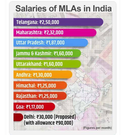 ਕੇਂਦਰੀ ਗ੍ਰਹਿ ਮੰਤਰਾਲੇ ਨੇ ਮਈ 'ਚ ਦਿੱਲੀ ਸਰਕਾਰ ਨੂੰ ਵਿਧਾਇਕਾਂ ਦੀਆਂ ਤਨਖ਼ਾਹਾਂ ਅਤੇ ਭੱਤਿਆਂ 'ਚ ਸੋਧ ਕਰਨ ਲਈ ਦਿੱਲੀ ਵਿਧਾਨ ਸਭਾ 'ਚ ਵਿਧਾਨਕ ਪ੍ਰਸਤਾਵ ਪੇਸ਼ ਕਰਨ ਲਈ ਆਪਣੀ ਪੂਰਵ ਪ੍ਰਵਾਨਗੀ ਤੋਂ ਜਾਣੂ ਕਰਾਇਆ ਸੀ। ਇੱਕ ਵਿਧਾਇਕ ਨੂੰ ਮਹੀਨਾਵਾਰ ਤਨਖਾਹ ਤੋਂ ਇਲਾਵਾ ਇਲਾਕੇ ਦੇ ਵਿਕਾਸ ਲਈ ਰਾਸ਼ੀ ਦਿੱਤੀ ਜਾਂਦੀ ਹੈ, ਜੋ ਹਰ ਸਾਲ 1 ਕਰੋੜ ਤੋਂ 8 ਕਰੋੜ ਰੁਪਏ ਤੱਕ ਹੁੰਦੀ ਹੈ।ਦਿੱਲੀ ਸਰਕਾਰ ਦਾ ਦਾਅਵਾ ਹੈ ਕਿ ਦਿੱਲੀ ਦੇ ਵਿਧਾਇਕਾਂ ਦੀ ਤਨਖਾਹ ਦੇਸ਼ 'ਚ ਸਭ ਤੋਂ ਘੱਟ ਹੈ। ਆਮ ਆਦਮੀ ਪਾਰਟੀ ਵੱਲੋਂ ਸੋਮਵਾਰ ਨੂੰ ਇੱਕ ਟਵੀਟ ਵੀ ਕੀਤਾ ਗਿਆ ਹੈ, ਜਿਸ 'ਚ ਦੇਸ਼ ਦੇ ਵੱਖ-ਵੱਖ ਸੂਬਿਆਂ ਦੇ ਵਿਧਾਇਕਾਂ ਦੀ ਤਨਖਾਹ ਬਾਰੇ ਜਾਣਕਾਰੀ ਦਿੱਤੀ ਗਈ ਹੈ। 'ਆਪ' ਦੇ ਟਵੀਟ ਮੁਤਾਬਕ ਤੇਲੰਗਾਨਾ ਦੇ ਵਿਧਾਇਕਾਂ ਦੀ ਸਭ ਤੋਂ ਵੱਧ ਤਨਖਾਹ ਹੈ। ਤਨਖ਼ਾਹ ਅਤੇ ਭੱਤਿਆਂ ਸਮੇਤ ਉਨ੍ਹਾਂ ਨੂੰ 2.50 ਲੱਖ ਰੁਪਏ ਪ੍ਰਤੀ ਮਹੀਨਾ ਮਿਲਦਾ ਹੈ।ਕਿਹੜੇ ਸੂਬੇ ਦੇ ਵਿਧਾਇਕਾਂ ਨੂੰ ਕਿੰਨੀ ਤਨਖਾਹ (ਤਨਖਾਹ+ਭੱਤਾ) ਮਿਲਦੀ ਹੈ?ਤੇਲੰਗਾਨਾ - 2.50 ਲੱਖ ਰੁਪਏਮਹਾਰਾਸ਼ਟਰ - 2.32 ਲੱਖ ਰੁਪਏਕਰਨਾਟਕ - 2.05 ਲੱਖ ਰੁਪਏਉੱਤਰ ਪ੍ਰਦੇਸ਼ - 1.87 ਲੱਖ ਰੁਪਏਉੱਤਰਾਖੰਡ - 1.60 ਲੱਖ ਰੁਪਏਆਂਧਰਾ ਪ੍ਰਦੇਸ਼ - 1.30 ਲੱਖ ਰੁਪਏਹਿਮਾਚਲ ਪ੍ਰਦੇਸ਼ - 1.25 ਲੱਖ ਰੁਪਏਰਾਜਸਥਾਨ - 1.25 ਲੱਖ ਰੁਪਏਗੋਆ - 1.17 ਲੱਖ ਰੁਪਏਹਰਿਆਣਾ - 1.15 ਲੱਖ ਰੁਪਏਪੰਜਾਬ - 1.14 ਲੱਖ ਰੁਪਏਬਿਹਾਰ - 1.14 ਲੱਖ ਰੁਪਏਪੱਛਮੀ ਬੰਗਾਲ - 1.13 ਲੱਖ ਰੁਪਏਝਾਰਖੰਡ - 1.11 ਲੱਖ ਰੁਪਏਮੱਧ ਪ੍ਰਦੇਸ਼ - 1.10 ਲੱਖ ਰੁਪਏਛੱਤੀਸਗੜ੍ਹ - 1.10 ਲੱਖ ਰੁਪਏਤਾਮਿਲਨਾਡੂ - 1.05 ਲੱਖ ਰੁਪਏਸਿੱਕਮ- 86 ਹਜ਼ਾਰ 500 ਰੁਪਏਕੇਰਲ - 70 ਹਜ਼ਾਰ ਰੁਪਏਗੁਜਰਾਤ - 65 ਹਜ਼ਾਰ ਰੁਪਏਓਡੀਸ਼ਾ - 62 ਹਜ਼ਾਰ ਰੁਪਏਮੇਘਾਲਿਆ - 59 ਹਜ਼ਾਰ ਰੁਪਏਪੁੱਡੂਚੇਰੀ - 50,000 ਰੁਪਏਅਰੁਣਾਚਲ ਪ੍ਰਦੇਸ਼ - 49 ਹਜ਼ਾਰ ਰੁਪਏਮਿਜ਼ੋਰਮ - 47 ਹਜ਼ਾਰ ਰੁਪਏਅਸਾਮ - 42 ਹਜ਼ਾਰ ਰੁਪਏਮਨੀਪੁਰ - 37 ਹਜ਼ਾਰ ਰੁਪਏਨਾਗਾਲੈਂਡ - 36 ਹਜ਼ਾਰ ਰੁਪਏਤ੍ਰਿਪੁਰਾ - 34 ਹਜ਼ਾਰ ਰੁਪਏ