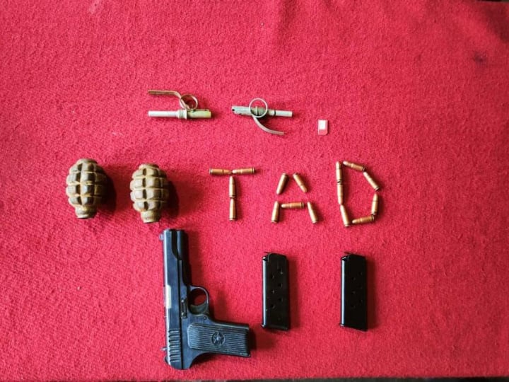ਉਨ੍ਹਾਂ ਦੱਸਿਆ ਕਿ ਤਲਾਸ਼ੀ ਦੌਰਾਨ ਇੱਕ ਪਿਸਤੌਲ, ਦੋ ਮੈਗਜ਼ੀਨ, 16 ਕਾਰਤੂਸ, ਦੋ ਹੈਂਡ ਗਰਨੇਡ, ਦੋ ਡੈਟੋਨੇਟਰ ਅਤੇ ਹੋਰ ਇਤਰਾਜ਼ਯੋਗ ਸਮੱਗਰੀ ਬਰਾਮਦ ਹੋਈ। ਬੁਲਾਰੇ ਅਨੁਸਾਰ ਇਸ ਸਬੰਧ ਵਿੱਚ ਕਾਨੂੰਨ ਦੀਆਂ ਸਬੰਧਤ ਧਾਰਾਵਾਂ ਤਹਿਤ ਮਾਮਲਾ ਦਰਜ ਕਰ ਲਿਆ ਗਿਆ ਹੈ ਅਤੇ ਅਗਲੇਰੀ ਕਾਰਵਾਈ ਕੀਤੀ ਜਾ ਰਹੀ ਹੈ।
