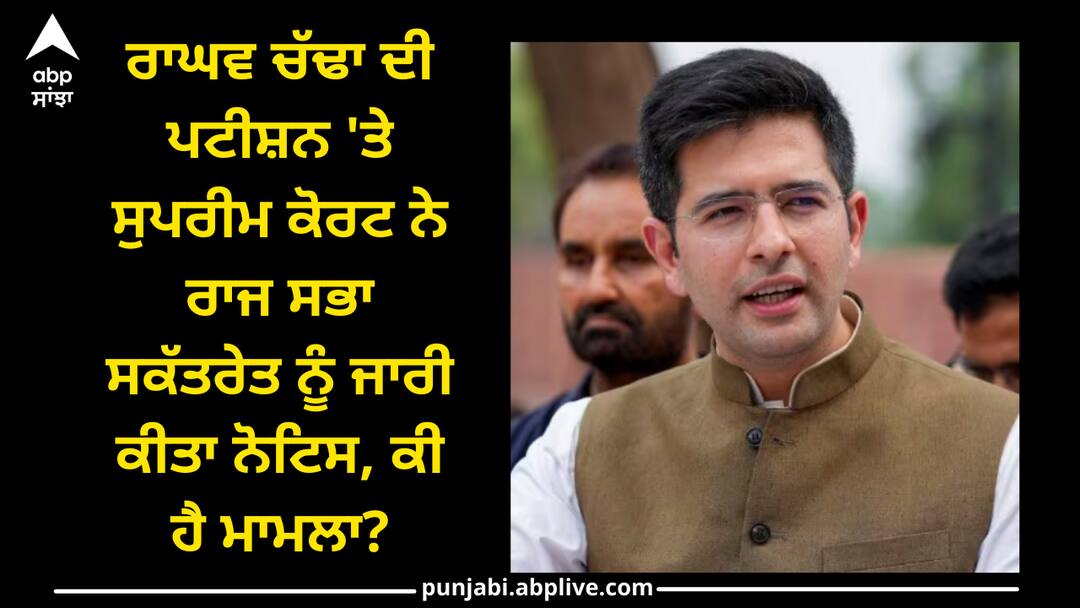 Raghav chadha: ਆਮ ਆਦਮੀ ਪਾਰਟੀ (ਆਪ) ਦੇ ਸੰਸਦ ਮੈਂਬਰ ਰਾਘਵ ਚੱਢਾ ਦੀ ਪਟੀਸ਼ਨ 'ਤੇ ਸੁਪਰੀਮ ਕੋਰਟ ਨੇ ਸੋਮਵਾਰ (16 ਅਕਤੂਬਰ) ਨੂੰ ਰਾਜ ਸਭਾ ਸਕੱਤਰੇਤ ਨੂੰ ਨੋਟਿਸ ਜਾਰੀ ਕੀਤਾ ਹੈ। ਅਗਲੀ ਸੁਣਵਾਈ 30 ਅਕਤੂਬਰ ਨੂੰ ਹੋਵੇਗੀ।