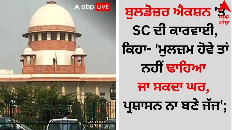 Supreme Court on Buldozer Action: ਸੁਪਰੀਮ ਕੋਰਟ ਨੇ ਬੁੱਧਵਾਰ (13 ਨਵੰਬਰ 2024) ਨੂੰ ਬੁਲਡੋਜ਼ਰ ਐਕਸ਼ਨ 'ਤੇ ਸੁਣਵਾਈ ਦੌਰਾਨ ਵੱਡੀ ਟਿੱਪਣੀ ਕੀਤੀ। ਅਦਾਲਤ ਨੇ ਕਿਹਾ ਕਿ ਸਰਕਾਰੀ ਸ਼ਕਤੀ ਦੀ ਦੁਰਵਰਤੋਂ ਨਹੀਂ ਹੋਣਾ ਚਾਹੀਦਾ। ਜੱਜ ਫੈਸਲਾ ਪੜ੍ਹ ਰਹੇ ਹਨ। ਜਸਟਿਸ ਗਵਈ ਨੇ ਕਵੀ ਪ੍ਰਦੀਪ ਦੀ ਇੱਕ ਕਵਿਤਾ ਦਾ ਹਵਾਲਾ ਦਿੰਦਿਆਂ ਕਿਹਾ ਕਿ ਘਰ ਇੱਕ ਸੁਪਨਾ ਹੈ, ਜੋ ਕਦੇ ਨਾ ਟੁੱਟੇ। ਜੱਜ ਨੇ ਅੱਗੇ ਕਿਹਾ ਕਿ ਜੁਰਮ ਦੀ ਸਜ਼ਾ ਘਰ ਨੂੰ ਢਾਹੁਣਾ ਨਹੀਂ ਹੋ ਸਕਦਾ। ਅਪਰਾਧ ਲਈ ਦੋਸ਼ ਜਾਂ ਦੋਸ਼ੀ ਪਾਇਆ ਜਾਣਾ ਘਰ ਨੂੰ ਢਾਹੁਣ ਦਾ ਆਧਾਰ ਨਹੀਂ ਹੈ।
