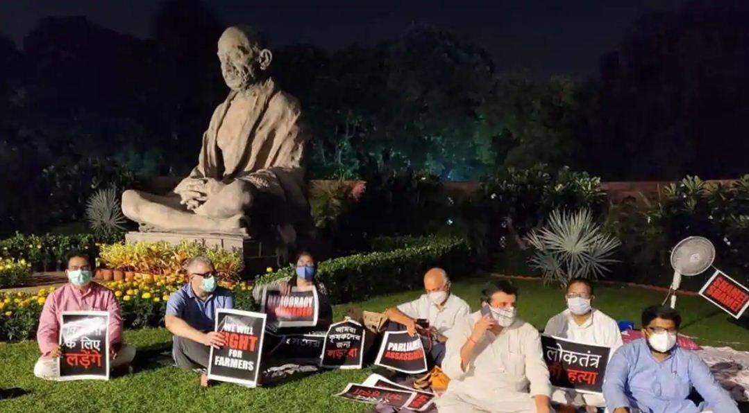 ਮੁਅੱਤਲ ਰਾਜ ਸਭਾ ਮੈਂਬਰਾਂ ਦਾ ਧਰਨਾ ਜਾਰੀ, ਸੰਸਦ ਕੰਪਲੈਕਸ ‘ਚ ਗਾਣੇ ਗਾ ਬਿਤਾਈ ਰਾਤ