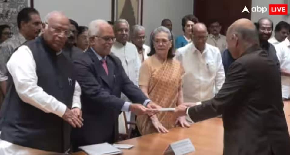 Vice President Election 2025: ਇੰਡੀਆ ਅਲਾਇੰਸ ਦੇ ਉਪ ਰਾਸ਼ਟਰਪਤੀ ਉਮੀਦਵਾਰ ਬੀ. ਸੁਦਰਸ਼ਨ ਰੈਡੀ ਨੇ ਵੀਰਵਾਰ (21 ਅਗਸਤ) ਨੂੰ ਆਪਣੀ ਨਾਮਜ਼ਦਗੀ ਦਾਖਲ ਕੀਤੀ। ਇਸ ਦੌਰਾਨ ਕਾਂਗਰਸ ਨੇਤਾ ਸੋਨੀਆ ਗਾਂਧੀ, ਸੰਸਦ ਮੈਂਬਰ ਰਾਹੁਲ ਗਾਂਧੀ, ਸਮਾਜਵਾਦੀ ਪਾਰਟੀ ਦੇ ਨੇਤਾ ਰਾਮ ਗੋਪਾਲ ਯਾਦਵ ਅਤੇ ਸੰਜੇ ਰਾਉਤ ਸਮੇਤ ਸਾਰੇ ਵਿਰੋਧੀ ਨੇਤਾ ਮੌਜੂਦ ਸਨ। ਸੁਦਰਸ਼ਨ ਰੈਡੀ ਉਪ ਰਾਸ਼ਟਰਪਤੀ ਚੋਣ ਵਿੱਚ ਐਨਡੀਏ ਉਮੀਦਵਾਰ ਸੀਪੀ ਰਾਧਾਕ੍ਰਿਸ਼ਨਨ ਦਾ ਸਾਹਮਣਾ ਕਰਨਗੇ।