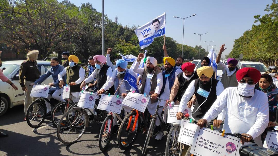 ਬਜਟ ਸੈਸ਼ਨ ਪੰਜਾਬ ਵਿਧਾਨ ਸਭਾ ਦੇ ਅੱਜ ਤੋਂ ਸ਼ੁਰੂ ਹੋਏ ਬਜਟ ਸੈਸ਼ਨ ਵਿੱਚ ਕੈਪਟਨ ਸਰਕਾਰ ਦੇ ਵਾਅਦਿਆਂ ਖਿਲਾਫ਼ ਆਮ ਆਦਮੀ ਪਾਰਟੀ ਦੇ ਵਿਧਾਇਕ ਸਾਈਕਲਾਂ 'ਤੇ ਵਿਧਾਨ ਸਭਾ ਪਹੁੰਚੇ ਹਨ। ਇਸ ਮੌਕੇ ਵਿਰੋਧੀ ਧਿਰ ਦੇ ਨੇਤਾ ਹਰਪਾਲ ਸਿੰਘ ਚੀਮਾ ਸਣੇ ਹੋਰਨਾਂ ਵਿਧਾਇਕਾਂ ਨੇ ਕਿਹਾ ਕਿ ਕੈਪਟਨ ਸਰਕਾਰ ਨੇ ਸਾਲ 2017 ਵਿੱਚ ਵਿਧਾਨ ਸਭਾ ਚੋਣਾਂ ਦੌਰਾਨ ਕੀਤੇ ਵਾਅਦਿਆਂ ਵਿੱਚੋਂ ਕੋਈ ਵਾਅਦਾ ਪੂਰਾ ਨਹੀਂ ਕੀਤਾ।