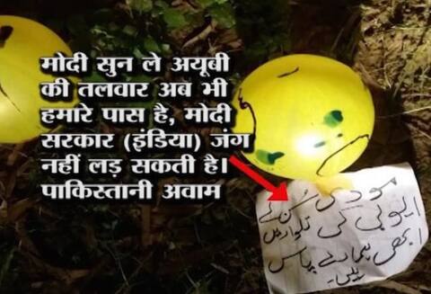 ਪਠਾਨਕੋਟ: ਭਾਰਤੀ ਫੌਜ ਵੱਲੋਂ ਪੀਓਕੇ 'ਚ ਸਰਜੀਕਲ ਸਟ੍ਰਾਈਕ ਤੋਂ ਬਾਅਦ ਭਾਰਤ-ਪਾਕਿ ਸਰਹੱਦ 'ਤੇ ਤਣਾਅ ਹੈ। ਭਾਰਤ ਦੀ ਕਾਰਵਾਈ ਤੋਂ ਪਾਕਿਸਤਾਨ ਦੀ ਬੌਖਲਾਹਟ ਸਾਫ ਦੇਖੀ ਜਾ ਰਹੀ ਹੈ। ਇਸੇ ਦੌਰਾਨ ਸ਼ਨੀਵਾਰ ਰਾਤ ਪੰਜਾਬ ਦੇ ਪਠਾਨਕੋਟ ਨਾਲ ਲਗਦੇ ਬਮਿਆਲ ਸੈਕਟਰ 'ਚ 2 ਪੀਲੇ ਰੇਗ ਦੇ ਗੁਬਾਰੇ ਬਰਾਮਦ ਹੋਏ ਹਨ। ਇਹਨਾਂ ਗੁਬਾਰਿਆਂ ਦੇ ਨਾਲ ਇੱਕ ਚਿੱਠੀ ਵੀ ਮਿਲੀ ਹੈ। ਇਸ ਚਿੱਟੀ 'ਚ ਉਰਦੂ ਭਾਸ਼ਾ 'ਚ ਮੋਦੀ ਦਾ ਨਾਮ ਲੈ ਕੇ ਧਮਕੀ ਦਿੱਤੀ ਗਈ ਹੈ। ਚਿੱਠੀ 'ਚ ਲਿਖਿਆ ਹੈ, "ਮੋਦੀ ਸੁਨ ਲੇ, ਅਯੂਬੀ ਦੀ ਤਲਵਾਰ ਅਜੇ ਵੀ ਸਾਡੇ ਕੋਲ ਹੈ। ਮੋਦੀ ਸਰਕਾਰ ਜੰਗ ਨਹੀਂ ਲੜ ਸਕਦੀ।" ਇਸ ਚਿੱਠੀ ਦੇ ਹੇਠਾਂ ਪਾਕਿਸਤਾਨੀ ਅਵਾਮ ਲਿਖਿਆ ਗਿਆ ਹੈ। ਜਿਕਰਯੋਗ ਹੈ ਕਿ ਪਠਾਨਕੋਟ ਉਹੀ ਇਲਾਕਾ ਹੈ, ਜਿੱਥੇ ਪਾਕਿਸਤਾਨ ਵੱਲੋਂ ਦੋ ਵੱਡੇ ਅੱਤਵਾਦੀ ਹਮਲਿਆਂ ਨੂੰ ਅੰਜਾਮ ਦਿੱਤਾ ਜਾ ਚੁੱਕਾ ਹੈ। ਫਿਲਹਾਵ ਗੁਬਾਰਿਆਂ ਨੂੰ ਜ਼ਬਤ ਕਰ ਜਾਂਚ ਲਈ ਭੇਜ ਦਿੱਤਾ ਗਿਆ ਹੈ।