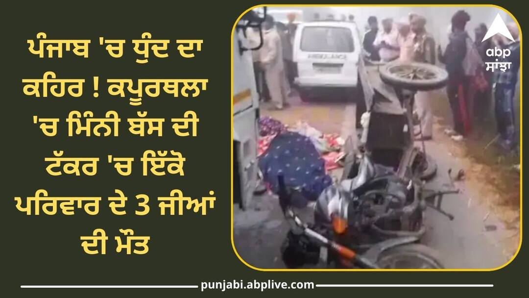 Punjab News: ਕਪੂਰਥਲਾ 'ਚ ਧੁੰਦ ਕਾਰਨ ਫਗਵਾੜਾ-ਹੁਸ਼ਿਆਰਪੁਰ ਰੋਡ 'ਤੇ ਪਿੰਡ ਜਗਜੀਤਪੁਰ ਨੇੜੇ ਸ਼ਨੀਵਾਰ ਸਵੇਰੇ ਇੱਕ ਮਿੰਨੀ ਬੱਸ ਤੇ ਬਾਈਕ ਰਿਹੜੇ ਵਿਚਾਲੇ ਜ਼ਬਰਦਸਤ ਟੱਕਰ ਹੋ ਗਈ। ਇਸ ਹਾਦਸੇ ਵਿੱਚ ਇੱਕੋ ਪਰਿਵਾਰ ਦੇ ਇੱਕ ਬੱਚੇ ਸਮੇਤ ਤਿੰਨ ਜਣਿਆਂ ਦੀ ਮੌਤ ਹੋ ਗਈ, ਜਦੋਂ ਕਿ ਡੇਢ ਸਾਲ ਦੀ ਬੱਚੀ ਸਮੇਤ ਦੋ ਜ਼ਖ਼ਮੀ ਹੋ ਗਏ। ਹਾਦਸੇ ਦੀ ਸੂਚਨਾ ਮਿਲਦੇ ਹੀ ਥਾਣਾ ਰਾਵਲਪਿੰਡੀ ਦੇ ਐਸਐਚਓ ਕਿਰਪਾਲ ਸਿੰਘ ਪੁਲਿਸ ਪਾਰਟੀ ਸਮੇਤ ਮੌਕੇ ’ਤੇ ਪੁੱਜੇ ਤੇ ਜ਼ਖ਼ਮੀਆਂ ਨੂੰ ਸਿਵਲ ਹਸਪਤਾਲ ਦਾਖ਼ਲ ਕਰਵਾਇਆ।