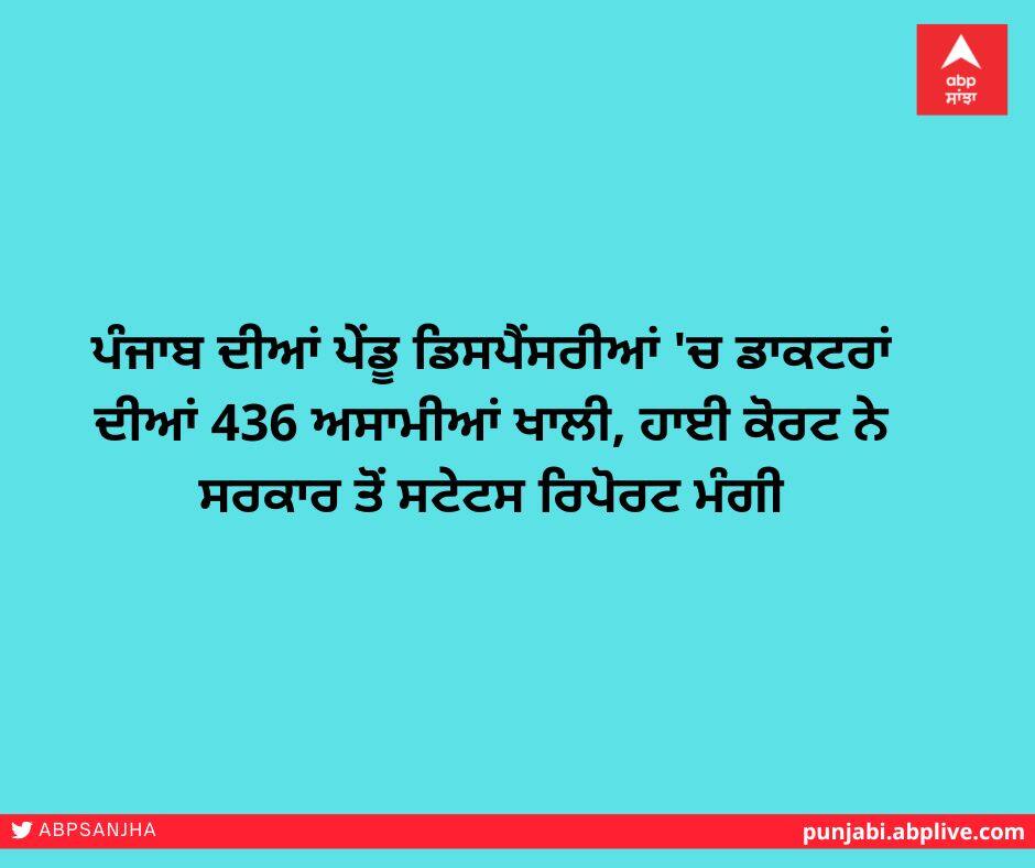 Punjab News : ਪੰਜਾਬ ਦੀਆਂ ਪੇਂਡੂ ਡਿਸਪੈਂਸਰੀਆਂ ਵਿੱਚ ਡਾਕਟਰਾਂ ਦੀਆਂ 436 ਖਾਲੀ ਅਸਾਮੀਆਂ ਨੂੰ ਭਰਨ ਦੀ ਮੰਗ ਕਰਨ ਵਾਲੀ ਜਨਹਿਤ ਪਟੀਸ਼ਨ 'ਤੇ ਪੰਜਾਬ-ਹਰਿਆਣਾ ਹਾਈ ਕੋਰਟ ਨੇ ਪੰਜਾਬ ਸਰਕਾਰ ਨੂੰ ਮੌਜੂਦਾ ਅਸਾਮੀਆਂ ਦੀ ਸਥਿਤੀ ਰਿਪੋਰਟ ਦਾਇਰ ਕਰਨ ਦੇ ਹੁਕਮ ਦਿੱਤੇ ਹਨ।