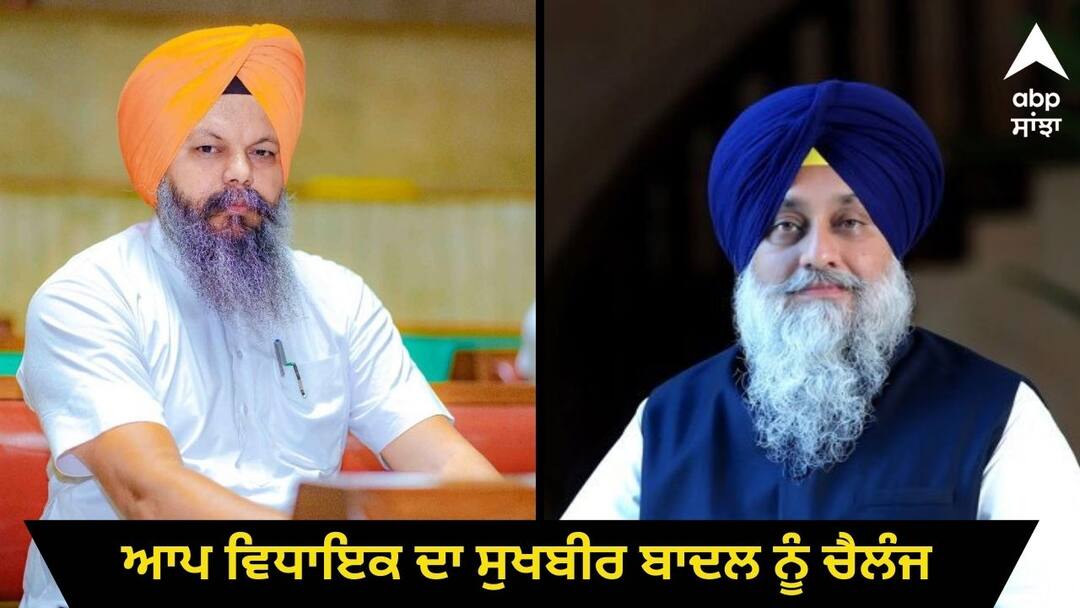 Punjab News: ਮੁੱਖ ਮੰਤਰੀ ਭਗਵੰਤ ਮਾਨ ਵੱਲੋਂ ਵਿਧਾਨ ਸਭਾ ਵਿੱਚ ਦਾੜ੍ਹੀ ਨੂੰ ਲੈ ਕੇ ਕੀਤੀ ਗਈ ਟਿੱਪਣੀ ਨੂੰ ਲੈ ਕੇ ਪੰਜਾਬ ਵਿੱਚ ਸਿਆਸੀ ਪਾਰਾ ਚੜ੍ਹ ਗਿਆ ਹੈ। ਇਸ ਮੁੱਦੇ 'ਤੇ ਵਿਰੋਧੀਆਂ ਨੇ ਆਮ ਆਦਮੀ ਪਾਰਟੀ ਤੇ ਖ਼ਾਸ ਕਰਕੇ ਮੁੱਖ ਮੰਤਰੀ ਭਗਵੰਤ ਮਾਨ ਨੂੰ ਘੇਰਿਆ ਹੈ। ਹੁਣ ਇਸ ਮਾਮਲੇ ਵਿੱਚ ਆਪ ਦੇ ਪਾਇਲ ਤੋਂ ਵਿਧਾਇਕ ਮਨਵਿੰਦਰ ਸਿੰਘ ਗਿਆਸਪੁਰਾ ਨੇ ਸੁਖਬੀਰ ਸਿੰਘ ਬਾਦਲ ਨੂੰ ਚੈਲੰਜ ਕਰ ਦਿੱਤਾ ਹੈ।