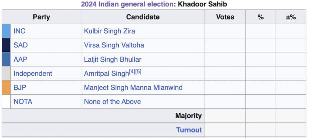 ਇਹ ਸੀਟ ਆਜ਼ਾਦ ਉਮੀਦਵਾਰ ਤੇ ਖਾਲਿਸਤਾਨ ਸਮਰਥਕ ਅੰਮ੍ਰਿਤਪਾਲ ਸਿੰਘ, ਆਮ ਆਦਮੀ ਪਾਰਟੀ ਦੇ ਲਾਲਜੀਤ ਸਿੰਘ ਭੁੱਲਰ ਤੇ ਕਾਂਗਰਸ ਦੇ ਕੁਲਬੀਰ ਸਿੰਘ ਜ਼ੀਰਾ ਵਿਚਕਾਰ ਹੈ। ਇੱਥੋਂ ਭਾਜਪਾ ਵੱਲੋਂ ਮਨਜੀਤ ਸਿੰਘ ਮੰਨਾ ਮੀਆਂਵਿੰਡ ਚੋਣ ਲੜ ਰਹੇ ਹਨ। ਇੱਥੇ ਕੁੱਲ 27 ਉਮੀਦਵਾਰ ਮੈਦਾਨ ਵਿੱਚ ਹਨ।