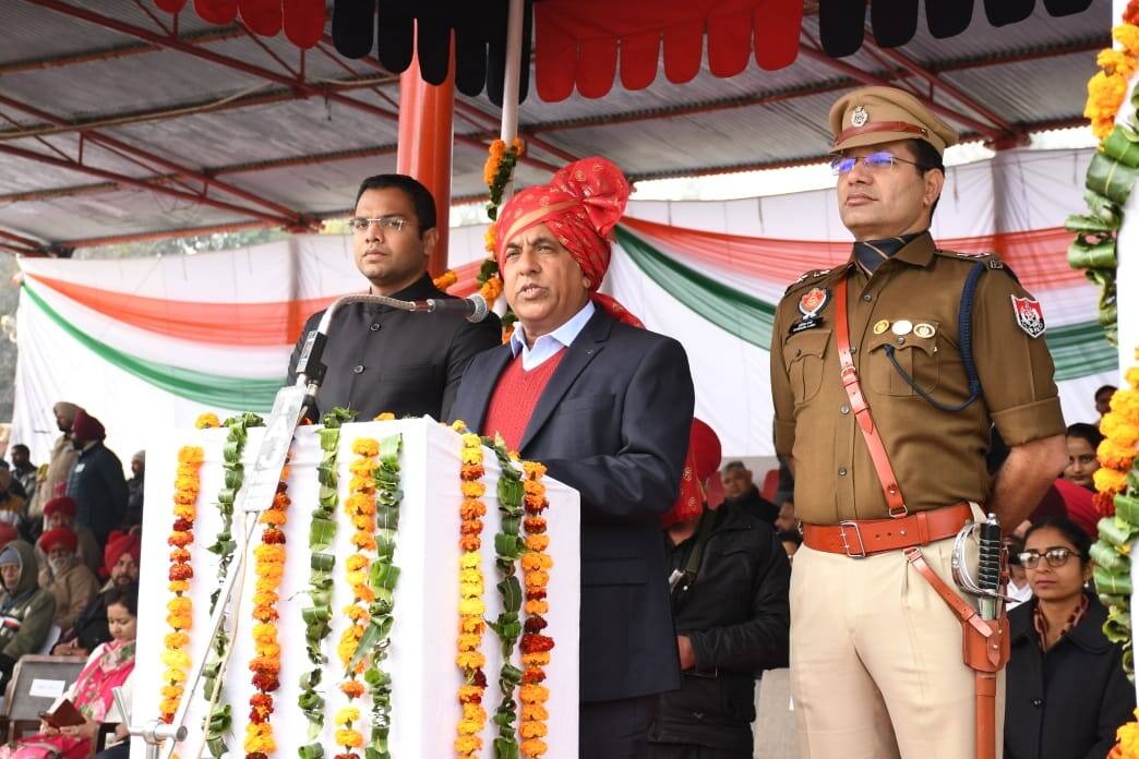 ਜਿੰਪਾ ਨੇ ਕਿਹਾ ਕਿ ਮੁੱਖ ਮੰਤਰੀ ਭਗਵੰਤ ਮਾਨ ਦੀ ਅਗਵਾਈ ਹੇਠ ਅੱਜ ਪੰਜਾਬ ਬਿਜਲੀ, ਖੇਤੀਬਾੜੀ, ਸਿੱਖਿਆ, ਲਾਅ ਐਂਡ ਆਰਡਰ, ਨਾਗਰਿਕ ਸੇਵਾਵਾਂ, ਬੁਨਿਆਦੀ ਢਾਂਚੇ, ਸ਼ਹਿਰੀ ਵਿਕਾਸ, ਪਿੰਡਾਂ ਦੇ ਸਰਵਪੱਖੀ ਵਿਕਾਸ, ਪੰਚਾਇਤੀ ਜ਼ਮੀਨ ’ਤੋਂ ਨਾਜਾਇਜ਼ ਕਬਜੇ ਛੁਡਾਉਣ, ਸਿਹਤ, ਨਿਵੇਸ਼ ਪੱਖੀ ਮਾਹੌਲ ਸਿਰਜਣ ਅਤੇ ਉਦਯੋਗ ਦੇ ਖੇਤਰ ਵਿੱਚ ਨਾਮਣਾ ਖੱਟ ਰਿਹਾ ਹੈ। ਉਨ੍ਹਾਂ ਇਸ ਗੱਲ ’ਤੇ ਖੁਸ਼ੀ ਪ੍ਰਗਟਾਈ ਅਤੇ ਮਾਣ ਮਹਿਸੂਸ ਕੀਤਾ ਕਿ ਉਨ੍ਹਾਂ ਨੂੰ ਪੰਜਾਬ ਦੇ ਹੁਣ ਤੱਕ ਦੇ ਸਭ ਤੋਂ ਹਰਮਨ ਪਿਆਰੇ ਅਤੇ ਲੋਕ ਹਿਤੈਸ਼ੀ ਮੁੱਖ ਮੰਤਰੀ ਭਗਵੰਤ ਮਾਨ ਦੇ ਜ਼ਿਲ੍ਹੇ ਨਾਲ ਸਬੰਧਿਤ ਵਾਸੀਆਂ ਨੂੰ ਸੰਬੋਧਨ ਕਰਨ ਦਾ ਸੁਭਾਗ ਪ੍ਰਾਪਤ ਹੋਇਆ ਹੈ। ਕੈਬਨਿਟ ਮੰਤਰੀ ਨੇ ਕਿਹਾ ਕਿ ਮੁੱਖ ਮੰਤਰੀ ਦੀ ਪਹਿਲ ਸਦਕਾ ਸੂਬੇ ਦੇ ਲੋਕਾਂ ਨੂੰ ਬਿਹਤਰ ਸਿਹਤ ਸਹੂਲਤਾਂ ਦੇਣ ਲਈ 27 ਜਨਵਰੀ ਤੋਂ ਕੁੱਲ 500 ਆਮ ਆਦਮੀ ਕਲੀਨਿਕ ਪੰਜਾਬ ਵਾਸੀਆਂ ਨੂੰ ਸਮਰਪਿਤ ਕੀਤੇ ਜਾ ਰਹੇ ਹਨ। ਪੰਜਾਬ ਨੂੰ ਖੇਡਾਂ ’ਚ ਮੋਹਰੀ ਸੂਬਾ ਬਨਾਉਣ ਦੇ ਯਤਨਾਂ ਬਾਰੇ ਦੱਸਦਿਆਂ ਉਨ੍ਹਾਂ ਕਿਹਾ ਕਿ ਖੇਡ ਵਿਭਾਗ ਨੇ ਬਲਾਕ ਤੋਂ ਸੂਬਾ ਪੱਧਰ ਤੱਕ ‘ਖੇਡਾਂ ਵਤਨ ਪੰਜਾਬ ਦੀਆਂ-2022’ ਕਰਵਾਈਆਂ ਜਿਸ ਵਿਚ 3 ਲੱਖ ਦੇ ਕਰੀਬ ਖਿਡਾਰੀਆਂ ਨੇ ਹਿੱਸਾ ਲਿਆ ਅਤੇ 9961 ਜੇਤੂ ਖਿਡਾਰੀਆਂ ਨੂੰ 6.85 ਕਰੋੜ ਰੁਪਏ ਦੀ ਇਨਾਮ ਰਾਸ਼ੀ ਵੰਡੀ ਗਈ। ਆਪਣੇ ਮਹਿਕਮੇ ਮਾਲ ਵਿਭਾਗ ਬਾਰੇ ਜਿੰਪਾ ਨੇ ਦੱਸਿਆ ਕਿ ਖਾਨਗੀ ਤਕਸੀਮ ਕਰਨ ਦੀ ਪ੍ਰਕਿਰਿਆ ਨੂੰ ਅਸਰਦਾਰ ਅਤੇ ਪ੍ਰਭਾਵੀ ਬਣਾਉਣ ਲਈ ਪੰਜਾਬ ਸਰਕਾਰ ਨੇ ਇਕ ਵੈੰਬਸਾਈਟ ਸ਼ੁਰੂ ਕੀਤੀ ਹੈ ਜਿਸ ਨਾਲ ਨਿਸ਼ਾਨਦੇਹੀ ਕਰਵਾਉਣੀ ਸੁਖਾਲੀ ਹੋਵੇਗੀ ਅਤੇ ਜ਼ਮੀਨ ਦੀ ਖਰੀਦ ਫਰੋਖਤ ਵਿਚ ਆਸਾਨੀ ਹੋਵੇਗੀ। ਉਨ੍ਹਾਂ ਅੱਗੇ ਕਿਹਾ ਕਿ ਮਾਲ ਵਿਭਾਗ ਦੇ ਕੰਮ ਨੂੰ ਹੋਰ ਸੁਚਾਰੂ ਕਰਨ ਦੇ ਮਕਸਦ ਨਾਲ 1090 ਨਵੇਂ ਪਟਵਾਰੀਆਂ ਦੀ ਭਰਤੀ ਮੁਕੰਮਲ ਕੀਤੀ ਗਈ ਹੈ ਅਤੇ ਮੰਤਰੀ ਮੰਡਲ ਵੱਲੋਂ ਪਟਵਾਰੀਆਂ ਦੀਆਂ 710 ਹੋਰ ਨਵੀਆਂ ਅਸਾਮੀਆਂ ਭਰਨ ਦੀ ਪ੍ਰਵਾਨਗੀ ਦਿੱਤੀ ਗਈ ਹੈ। ਉਨ੍ਹਾਂ ਕਿਹਾ ਕਿ ਜਲਦ ਹੀ ਮਾਲ ਵਿਭਾਗ ਵਿਚ ਵੱਡੇ ਪੱਧਰ ’ਤੇ ਲੋਕ ਪੱਖੀ ਸੁਧਾਰ ਲਾਗੂ ਕੀਤੇ ਜਾਣਗੇ ਅਤੇ ਇਸ ਪਾਸੇ ਉਹ ਪੂਰੀ ਮਿਹਨਤ ਅਤੇ ਲਗਨ ਨਾਲ ਯਤਨ ਕਰ ਰਹੇ ਹਨ। ਸੂਬਾ ਸਰਕਾਰ ਦੇ ਇੱਕ ਹੋਰ ਦੂਰ-ਅੰਦੇਸ਼ੀ ਕਦਮ ਬਾਰੇ ਦੱਸਦਿਆਂ ਕੈਬਨਿਟ ਮੰਤਰੀ ਨੇ ਕਿਹਾ ਕਿ ਪੰਜਾਬ ਦੀ ਸਕੂਲੀ ਸਿੱਖਿਆ ਨੂੰ ਅੰਤਰਰਾਸ਼ਟਰੀ ਪੱਧਰ ਦਾ ਬਣਾਉਣ ਲਈ ਸਰਕਾਰ ਨੇ 100 ਸਕੂਲ ਆਫ਼ ਐਮੀਨੈਂਸ ਦੀ ਸ਼ੁਰੂਆਤ ਕੀਤੀ ਹੈ। ਉਨ੍ਹਾਂ ਕਿਹਾ ਕਿ ਪੰਜਾਬੀ ਭਾਸ਼ਾ ਦੀ ਪ੍ਰਫੁੱਲਤਾ ਲਈ ਸੂਬੇ ਭਰ ਵਿੱਚ 21 ਫਰਵਰੀ 2023 ਤੱਕ ਸਾਰੇ ਬੋਰਡ ਪੰਜਾਬੀ ਭਾਸ਼ਾ ਵਿੱਚ ਲਿਖਣੇ ਜ਼ਰੂਰੀ ਬਣਾਉਣ ਦੀ ਮੁਹਿੰਮ ਦੀ ਸ਼ੁਰੂਆਤ ਕੀਤੀ ਗਈ ਹੈ। ਆਪਣੇ ਸੰਬੋਧਨ ਦੇ ਸ਼ੁਰੂਆਤ ਵਿੱਚ ਜਿੰਪਾ ਨੇ ਕਿਹਾ ਕਿ ਆਜ਼ਾਦੀ ਤੋਂ ਬਾਅਦ 26 ਜਨਵਰੀ 1950 ਨੂੰ ਭਾਰਤੀ ਸੰਵਿਧਾਨ ਲਾਗੂ ਹੋ ਜਾਣ ਨਾਲ ਗਣਰਾਜ ਦੀ ਸਥਾਪਨਾ ਹੋਈ ਅਤੇ ਸਾਨੂੰ ਦੁਨੀਆਂ ਵਿਚ ਸਭ ਤੋਂ ਵੱਡੀ ਜਮਹੂਰੀਅਤ ਹੋਣ ਦਾ ਮਾਣ ਹਾਸਲ ਹੋਇਆ। ਉਨ੍ਹਾਂ ਕਿਹਾ ਕਿ ਅੱਜ ਦੇ ਦਿਨ ਭਾਰਤੀ ਸੰਵਿਧਾਨ ਦੇ ਨਿਰਮਾਤਾ ਡਾਕਟਰ ਭੀਮ ਰਾਓ ਅੰਬੇਦਕਰ ਦੇ ਯੋਗਦਾਨ ਨੂੰ ਵੀ ਅੱਖੋਂ-ਪਰੋਖੇ ਨਹੀਂ ਕੀਤਾ ਜਾ ਸਕਦਾ। ਇਸ ਤੋਂ ਪਹਿਲਾਂ ਕੈਬਨਿਟ ਮੰਤਰੀ ਜਿੰਪਾ ਨੇ ਪੁਲਿਸ ਲਾਈਨ ਵਿਖੇ ਐਮ.ਐਲ.ਏ ਸੰਗਰੂਰ ਨਰਿੰਦਰ ਕੌਰ ਭਰਾਜ, ਐਮ.ਐਲ.ਏ ਲਹਿਰਾ ਬਰਿੰਦਰ ਕੁਮਾਰ ਗੋਇਲ ਸਮੇਤ ਸ਼ਹੀਦੀ ਯਾਦਗਾਰ ਵਿਖੇ ਸ਼ਹੀਦਾਂ ਨੂੰ ਸ਼ਰਧਾ ਦੇ ਫੁੱਲ ਭੇਟ ਕੀਤੇ। ਸਟੇਡੀਅਮ ਵਿਖੇ ਰਾਸ਼ਟਰੀ ਝੰਡਾ ਲਹਿਰਾਉਣ ਉਪ