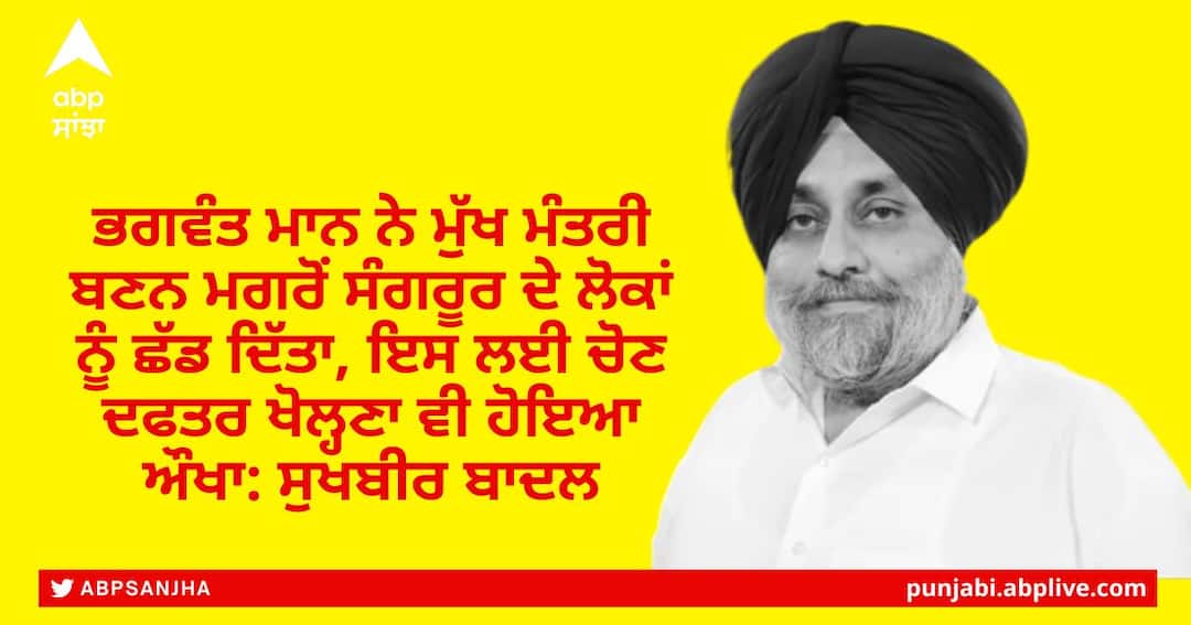 ਸੰਗਰੂਰ: ਸ਼੍ਰੋਮਣੀ ਅਕਾਲੀ ਦਲ ਦੇ ਪ੍ਰਧਾਨ ਸੁਖਬੀਰ ਬਾਦਲ ਨੇ ਕਿਹਾ ਕਿ ਭਗਵੰਤ ਮਾਨ ਨੇ ਮੁੱਖ ਮੰਤਰੀ ਬਣਨ ਤੋਂ ਬਾਅਦ ਸੰਗਰੂਰ ਦੇ ਲੋਕਾਂ ਨੂੰ ਛੱਡ ਦਿੱਤਾ ਹੈ। ਇਹੀ ਕਾਰਨ ਹੈ ਕਿ ਹੁਣ ਲੋਕ ਉਨ੍ਹਾਂ ਦੀ ਸੰਸਦੀ ਸੀਟ ’ਤੇ ਆਉਂਦੀ ਉਪ ਚੋਣ ਲਈ ਆਮ ਆਦਮੀ ਪਾਰਟੀ ਦਾ ਚੋਣ ਦਫਤਰ ਖੋਲ੍ਹਣ ਦਾ ਵਿਰੋਧ ਕਰ ਰਹੇ ਹਨ।