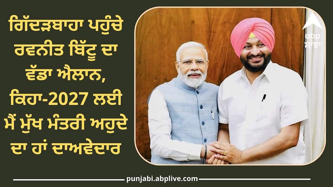Punjab News: ਪੰਜਾਬ ਦੀਆਂ ਚਾਰ ਵਿਧਾਨ ਸਭਾ ਸੀਟਾਂ ਲਈ ਹੋਣ ਜਾ ਰਹੀਆਂ ਜ਼ਿਮਨੀ ਚੋਣਾਂ ਨੂੰ ਲੈ ਕੇ ਸਿਆਸੀ ਸਰਗਰਮੀ ਤੇਜ਼ ਹੋ ਗਈ ਹੈ। ਇਸੇ ਦੌਰਾਨ ਕੇਂਦਰੀ ਰਾਜ ਮੰਤਰੀ ਰਵਨੀਤ ਸਿੰਘ ਬਿੱਟੂ ਅੱਜ (ਸੋਮਵਾਰ) ਗਿੱਦੜਬਾਹਾ ਪੁੱਜੇ। ਜਿੱਥੇ ਮੀਡੀਆ ਨਾਲ ਗੱਲਬਾਤ ਕਰਦੇ ਹੋਏ ਉਨ੍ਹਾਂ ਨੇ 2027 'ਚ ਹੋਣ ਵਾਲੀਆਂ ਵਿਧਾਨ ਸਭਾ ਚੋਣਾਂ 'ਚ ਮੁੱਖ ਮੰਤਰੀ ਦੇ ਅਹੁਦੇ ਲਈ ਦਾਅਵਾ ਪੇਸ਼ ਕੀਤਾ ਹੈ। ਇਸ ਮੌਕੇ ਬਿੱਟੂ ਨੇ ਸੂਬੇ ਦੀ ਸਰਕਾਰ ਉੱਤੇ ਜਮ ਕੇ ਨਿਸ਼ਾਨੇ ਸਾਧੇ।
